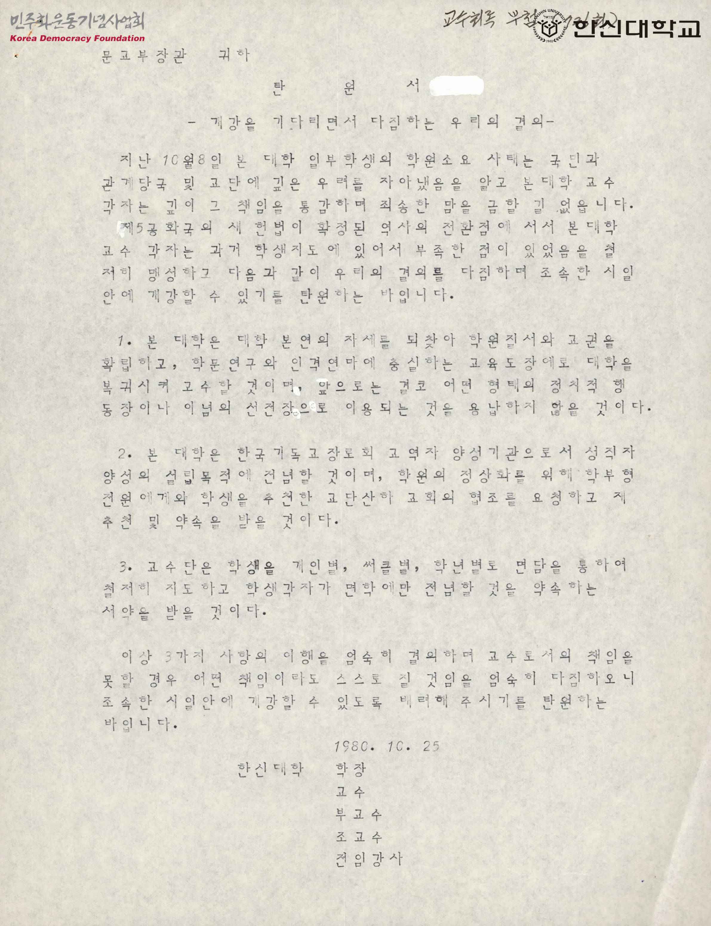 - 학원질서와 교권 확립, 학문연구와 인격연마에 충실하는 교육도장으로의 복귀, 정치 행동장이나 이념 선전장으로 이용을 용납하지 않을 것, 학원 정상화를 위해 학부형 전원과 추천 교단 산하 교회의 협조를 요청해 재추천 및 약속을 받을 것, 교수단의 학생에 대한 개인별, 서클별, 학년별 면담을 통해 면학 전념 서약을 받을 것 등의 내용을 약속하고 개강을 요청하는 탄원서