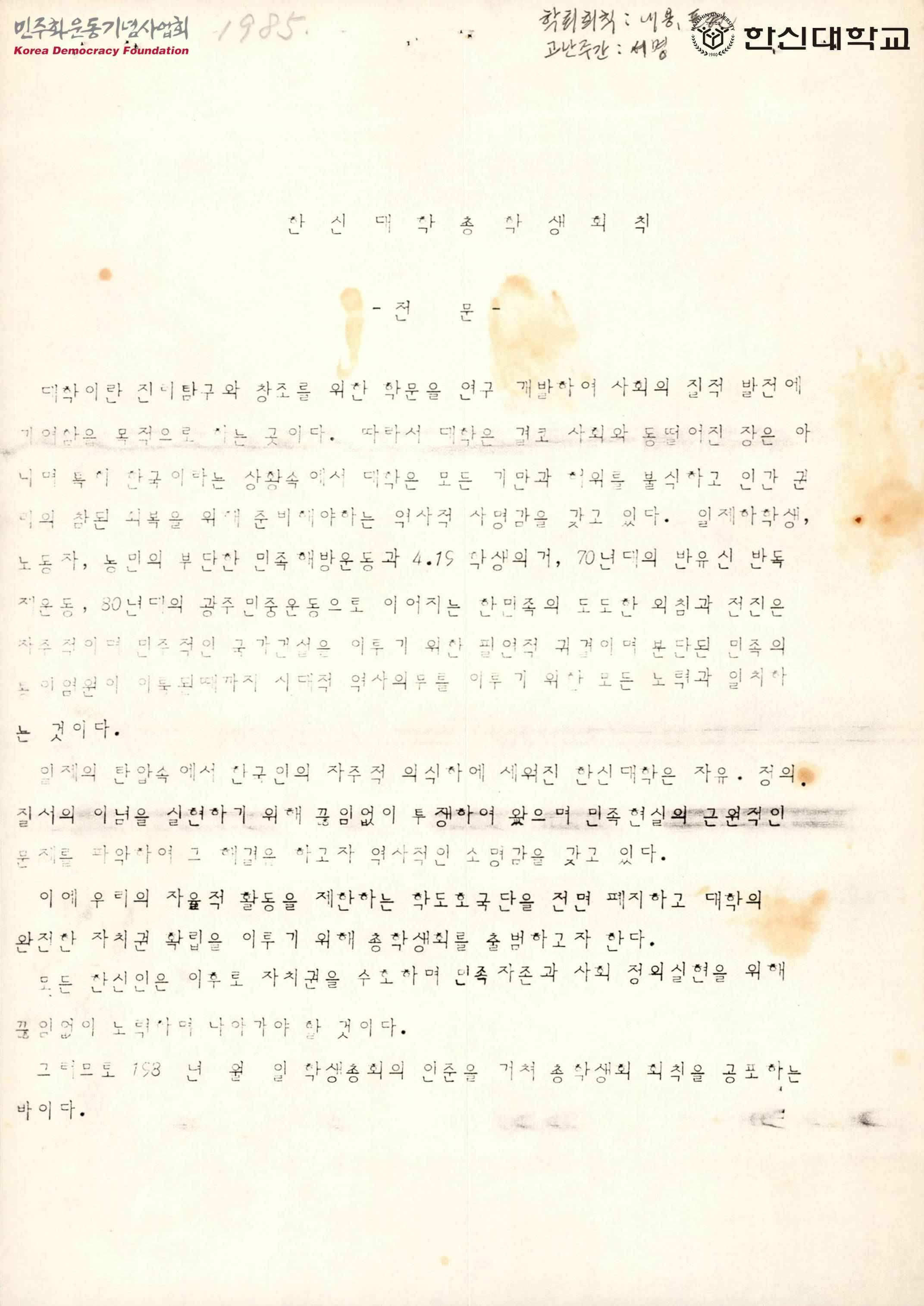 - 총학생회의 회칙으로 총학생회장이 학생복지문제나 학생자치활동 문제, 한신발전계획 문제 등을 상의하는 학교당국의 회의에 학생대표로 참가할 수 있음이 나타나 있다