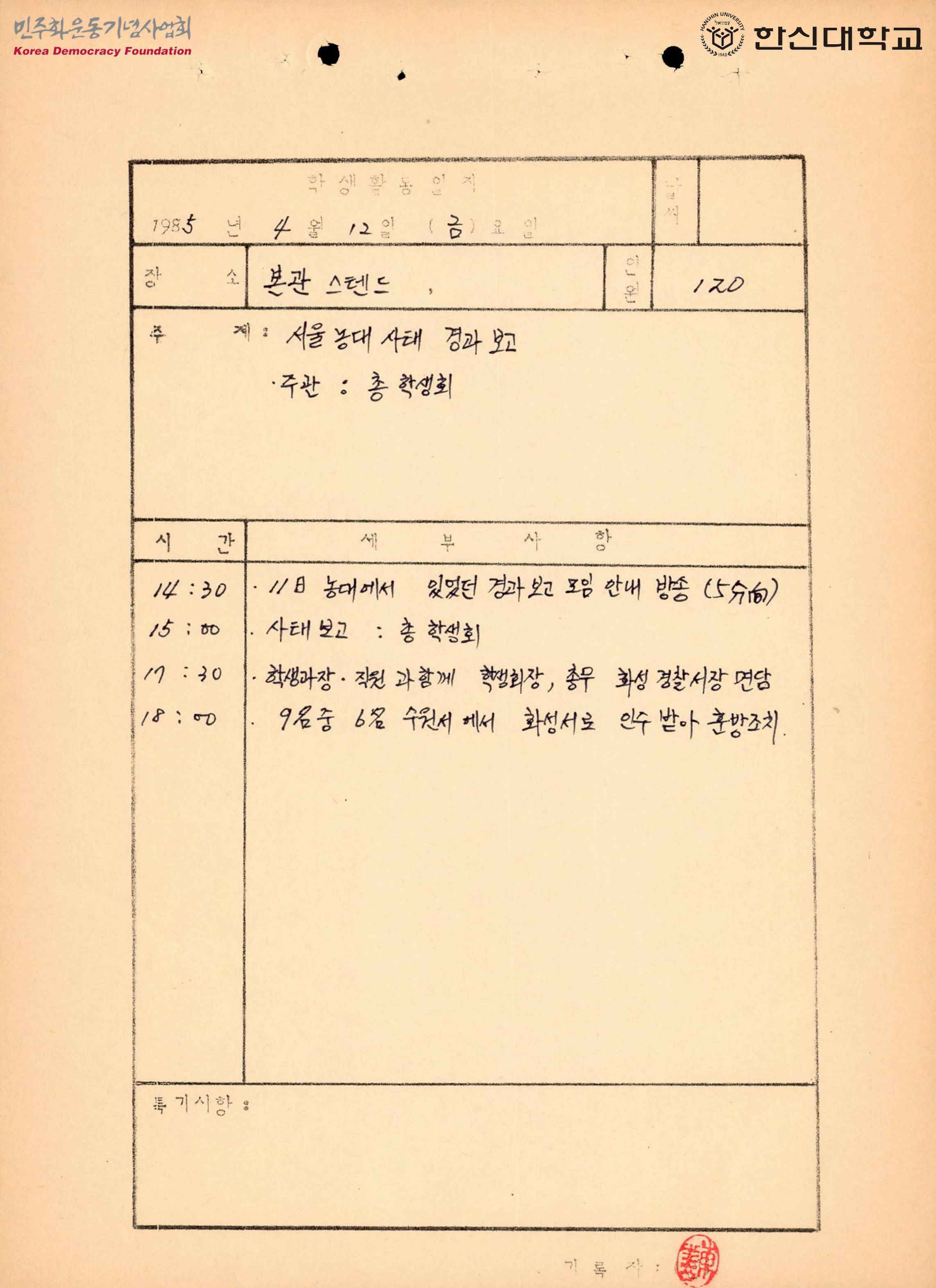- 11일 서울농대에서 있던건 경과 보고 모임 안내방송이 있었다는 것과 학생과장, 직원과 함께 학생회장과 총무가 화성경찰서장을 면담했다는 내용, 9명중 6명을 수원서에서 화성서로 인수 받아 훈방조치 했다는 내용 등이 적혀있음