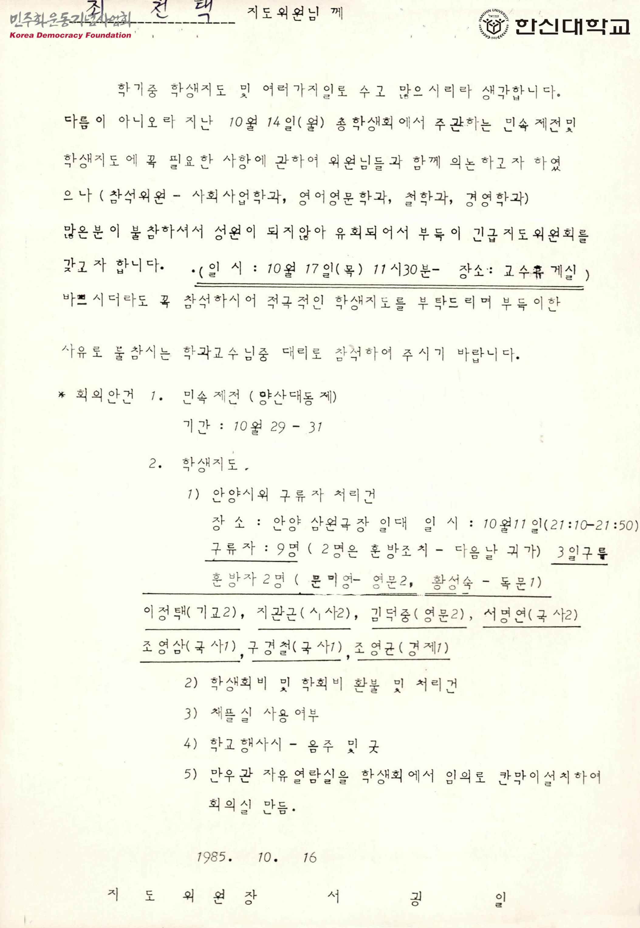 - 지난 회의가 많은 사람의 불참으로 성원이 되지 않아 부득이 긴급지도위원회를 갖고자 한다고 이유를 밝히며 회의 안건으로 민속제전과 안양시위 구류자 처리 건 등이 적혀있는 문서