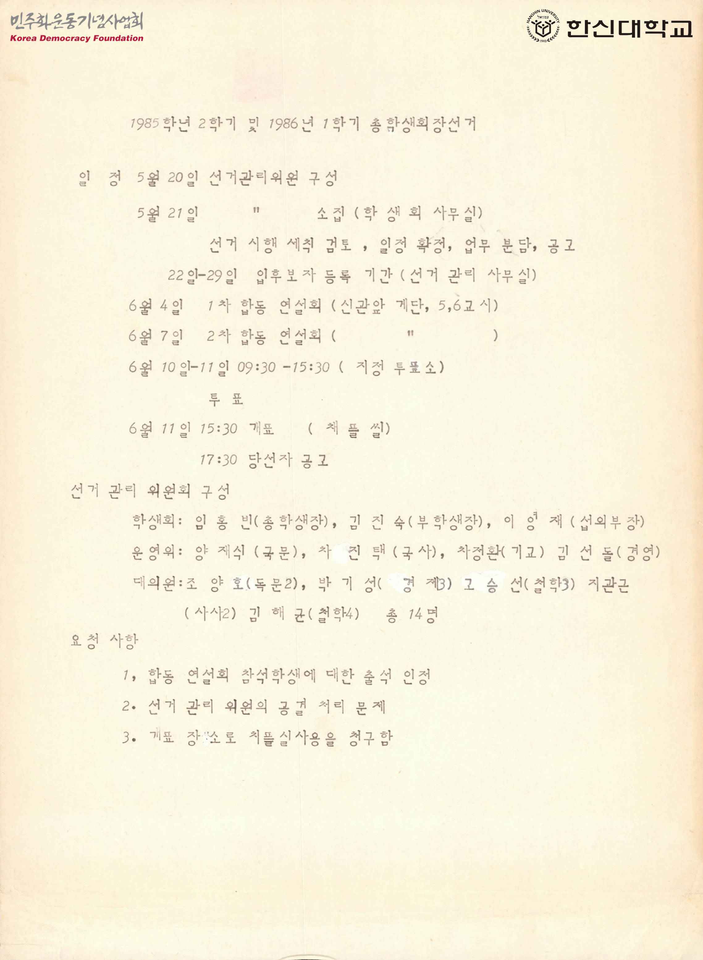 1985학년 2학기 및 1986년 1학기 한신대 총학생회장 선거
