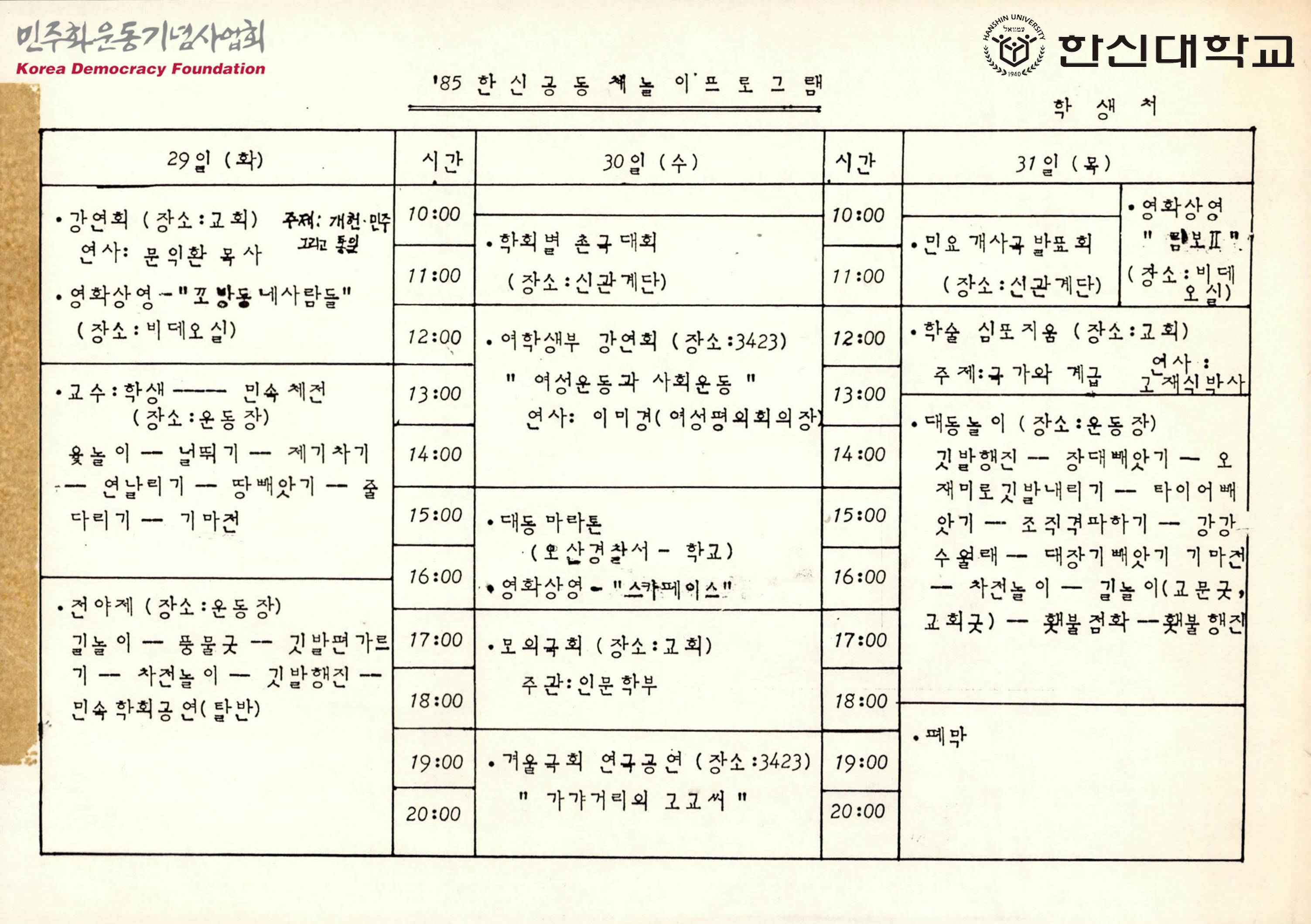 - 한신공동체놀이프로그램의 일정표로 문익환 목사의 강연회나 여성운동과 사회운동에 대한 강연회 등이 포함되 있음