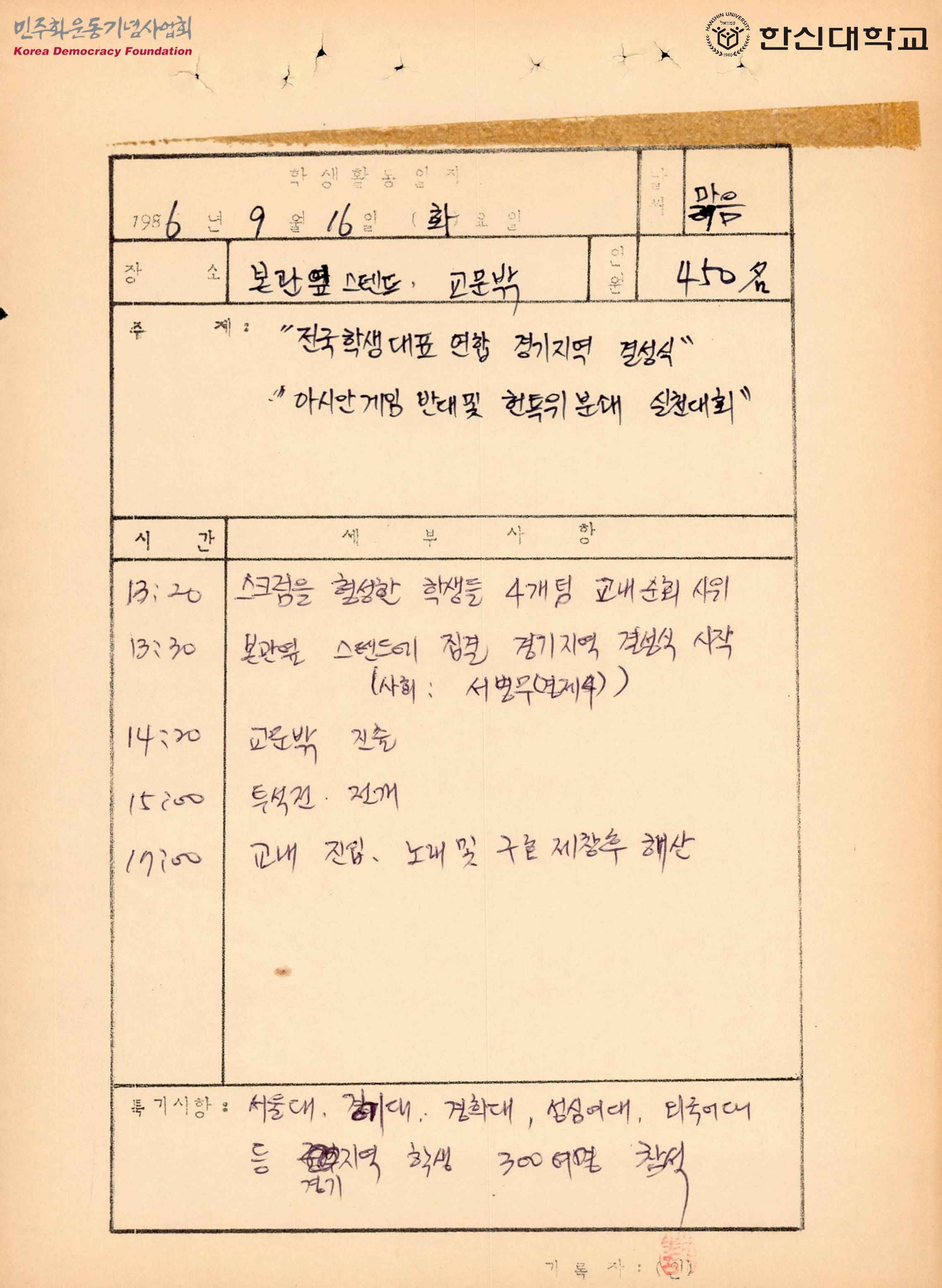 - 서울대, 경기대, 경희대, 성심여대, 외국어대 등 경기지역 학생 300여명이 참석한 전국학생대표연합 경기지역 결성식의 시간별 세부사항을 적어놓은 문서