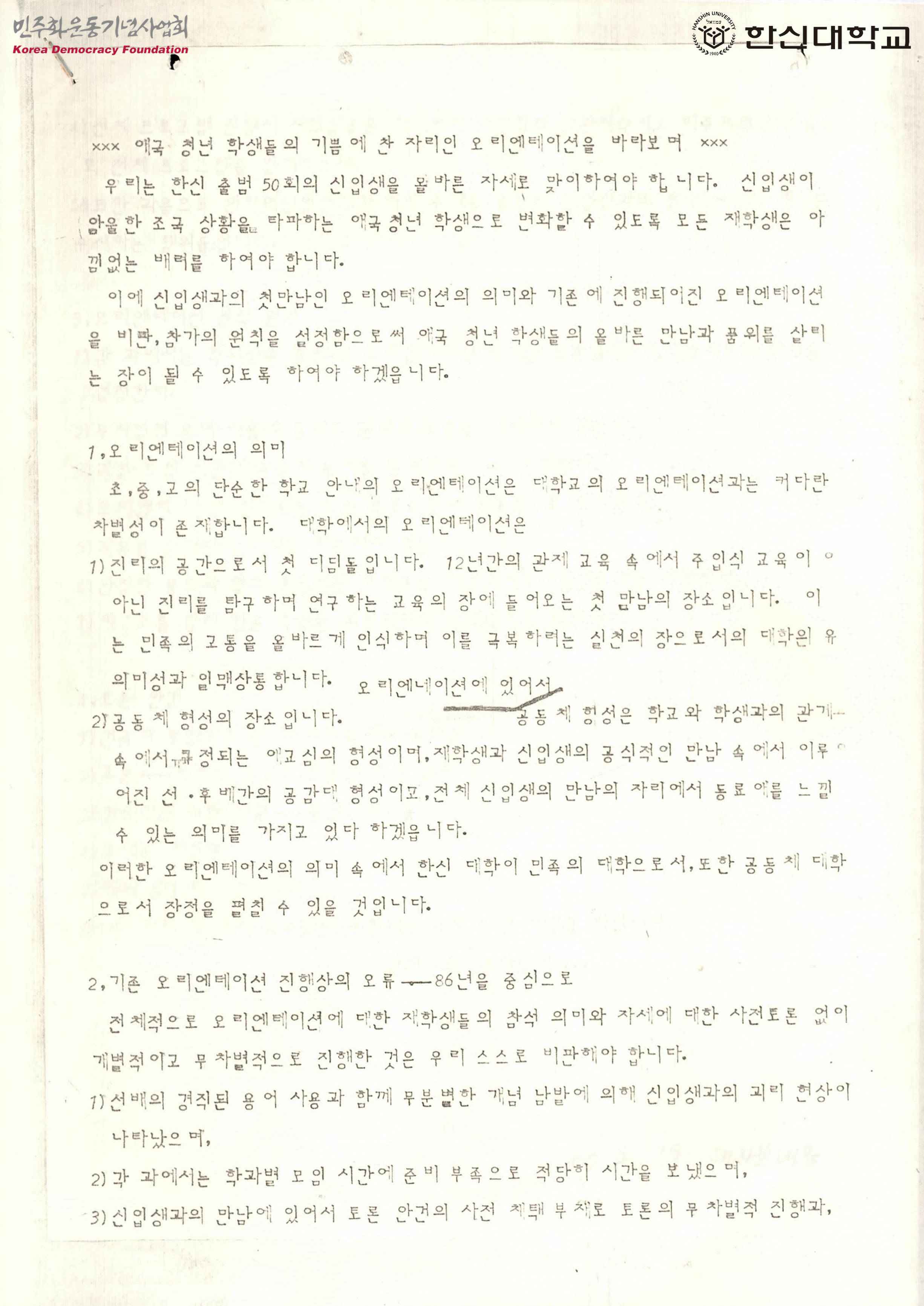 - 신입생들이 암울한 조국 상황을 타파하는 애국청년학생으로 변화할 수 있도록 하자며 오리엔테이션의 의미, 86년을 중심으로 한 기존 오리엔테이션의 오류해결, 오리엔테이션 참석원칙, 토론안건 등이 적힌 문서
