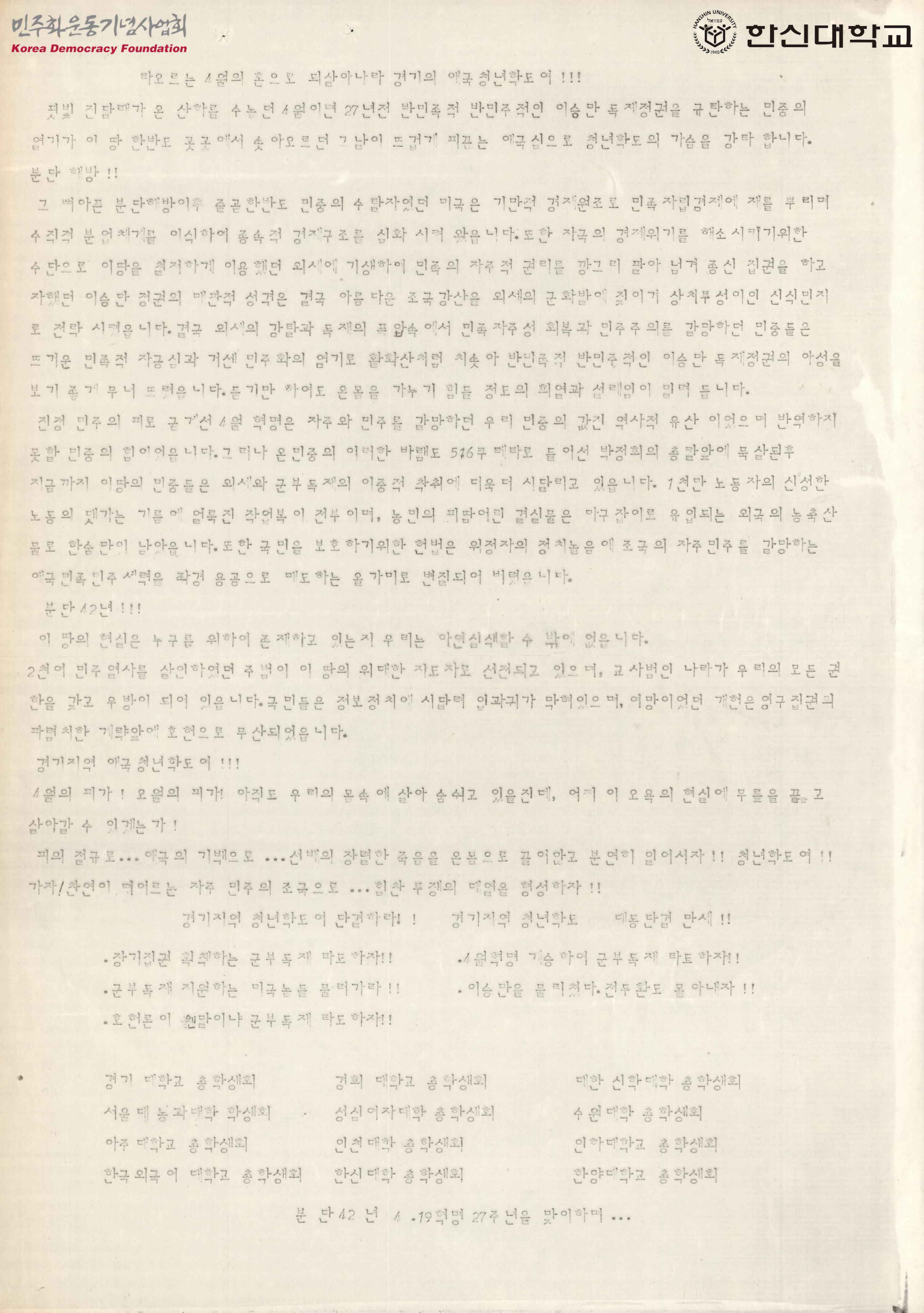 타오르는 4월의 혼으로 되살아나라 경기의 애국청년학도여!