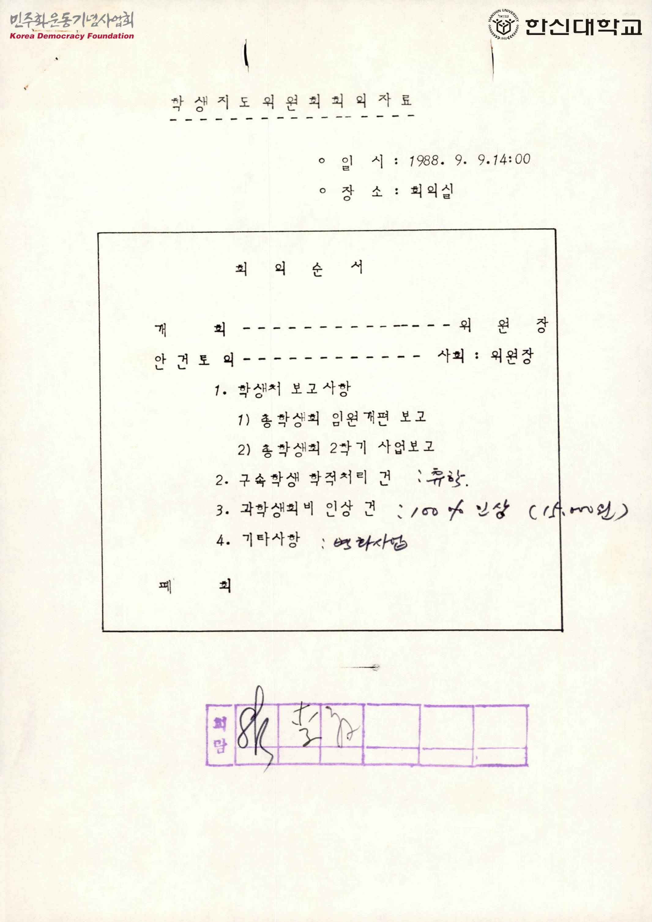 1988년 9월 9일 한신대 학생지도위원회 회의자료