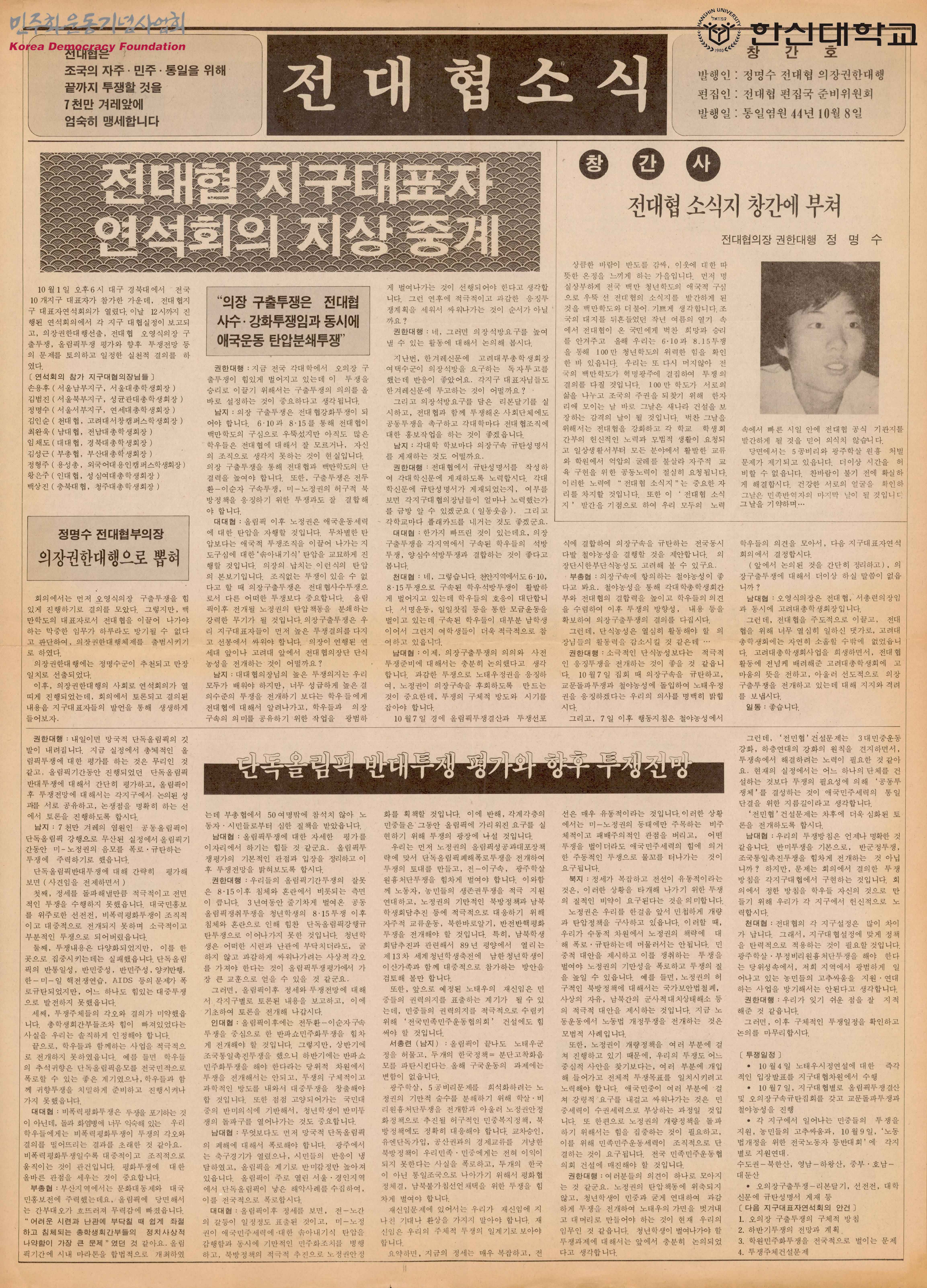 - 전대협 신문의 창간호로 단독올림픽 반대투쟁 평가와 향후투쟁전망, 전국 백만 청년학도에게 드리는 전대협 호소문, 전국 각 지구대협에서 전해온 소식 등이 수록됨