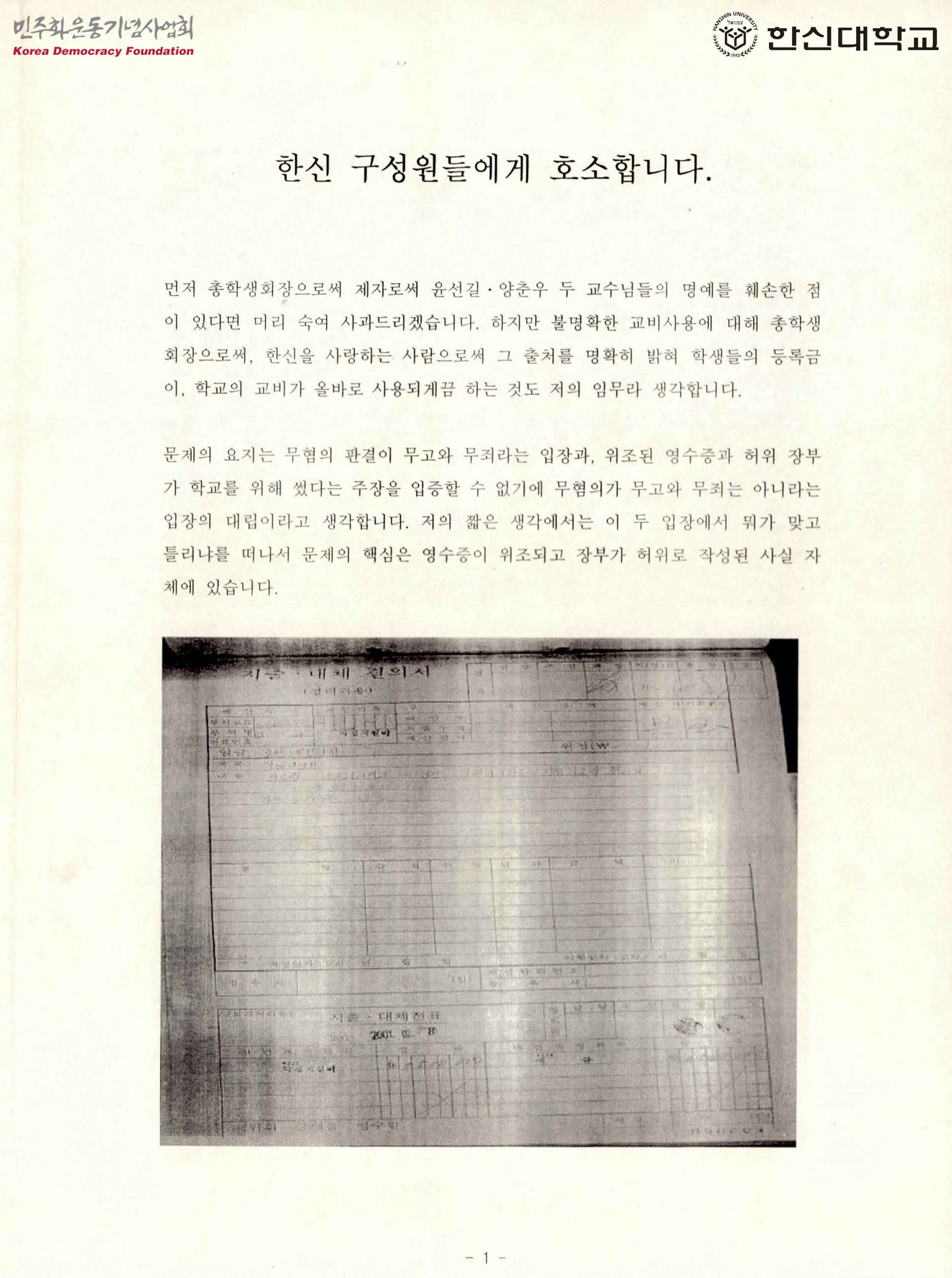 - 윤선길, 양춘우 두 교수가 불명확하게 교비를 사용한 점에 대해 명확하게 근거를 제시하지 않는다고 말하며 영수증이 왜 위조가 되었는지, 장부는 왜 허위로 작성되었는지에 대해 밝혀달라고 요청하는 글과 학우들에게 학생간의 대립이 아닌 연대로 문제를 해결해야 한다고 호소하는 내용의 글