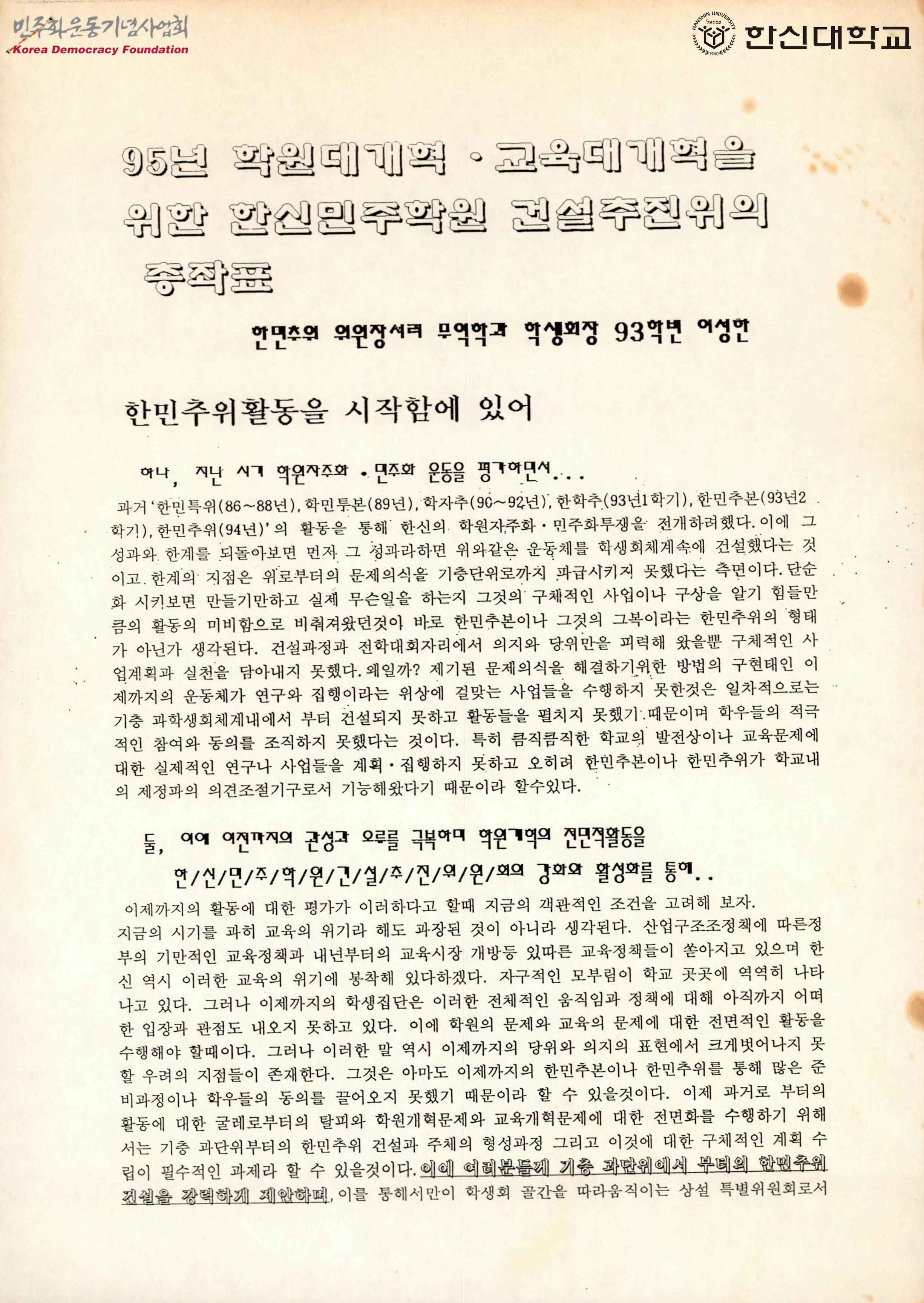 95년 학원대개혁・교육대개혁을 위한 한신민주학원 건설추진위의 총좌표 - 한민추위 활동을 시작함에 있어