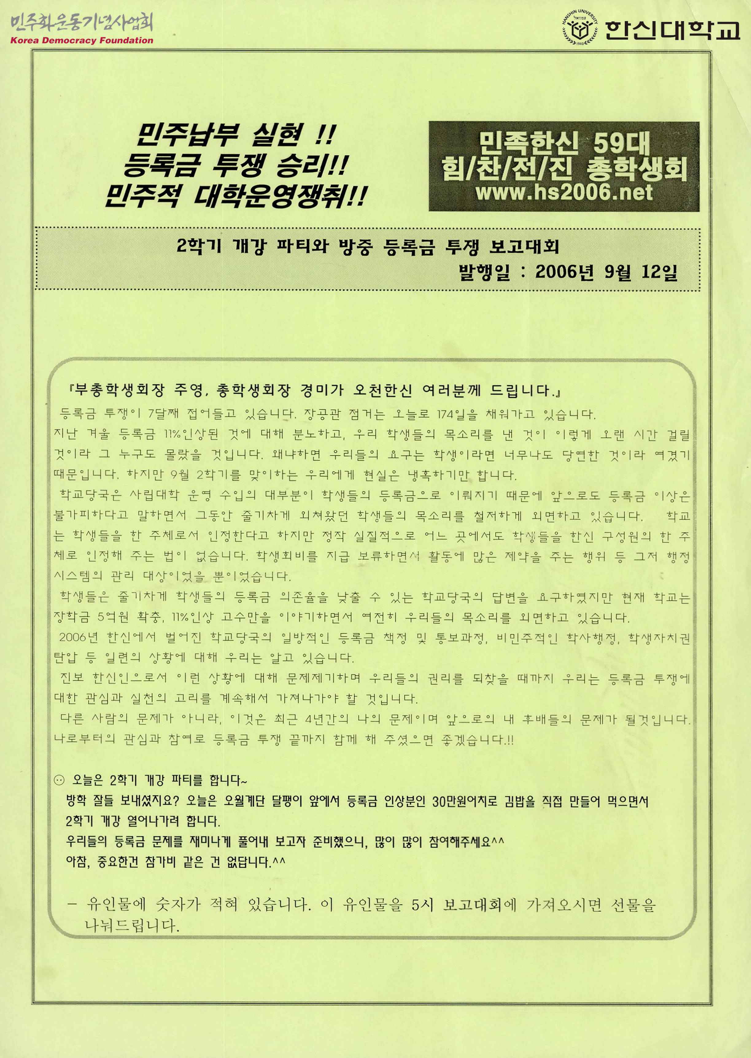 - 방학동안 진행되었던 등록금 납부 투쟁의 결과 보고와 2학기 개강파티에 대한 홍보, 민주납부를 독려하는 글 등이 수록된 문서