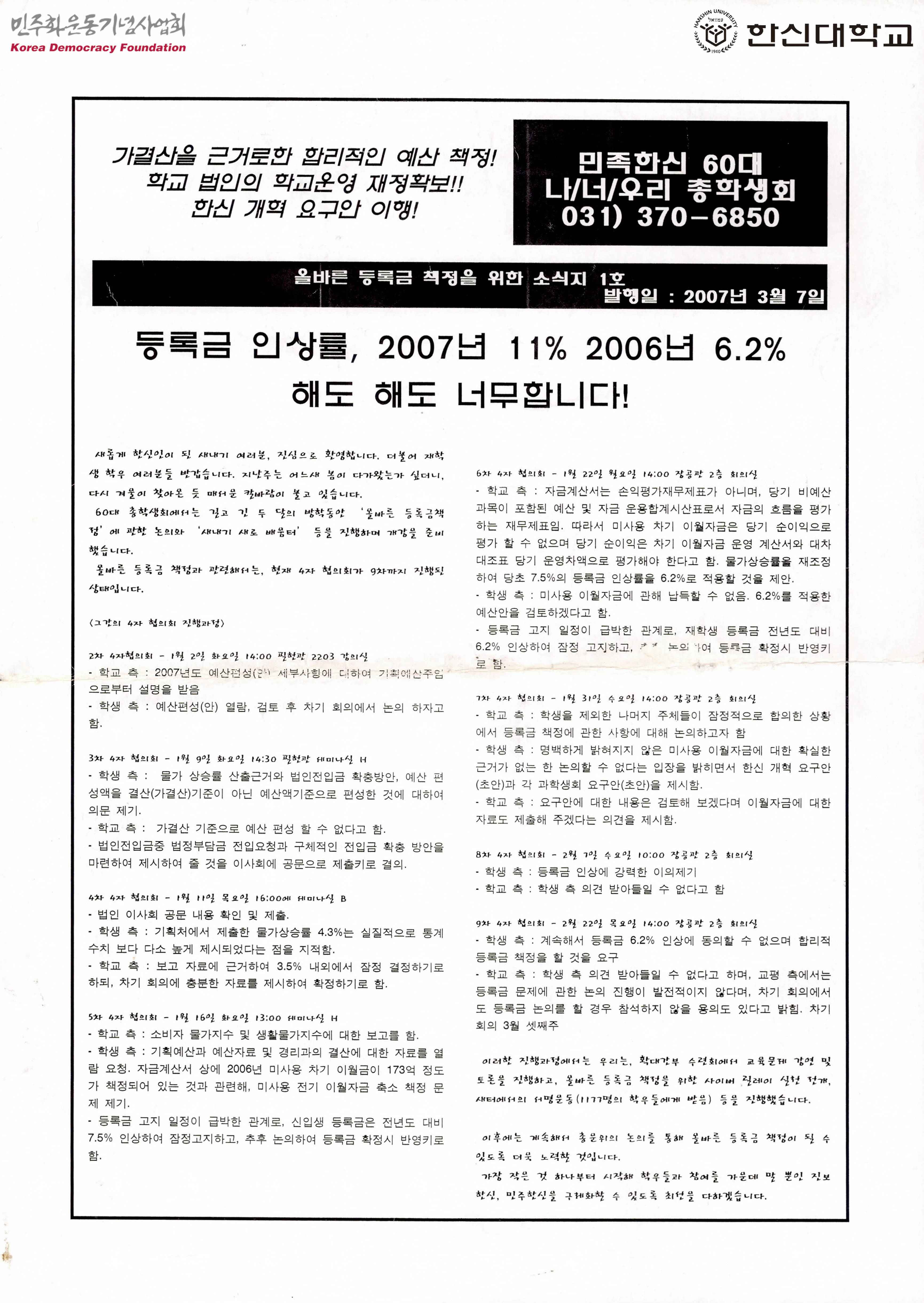 올바른 등록금 책정을 위한 소식지 1호 - 등록금 인상률, 2007년 11% 2006년 6.2% 해도 해도 너무 합니다