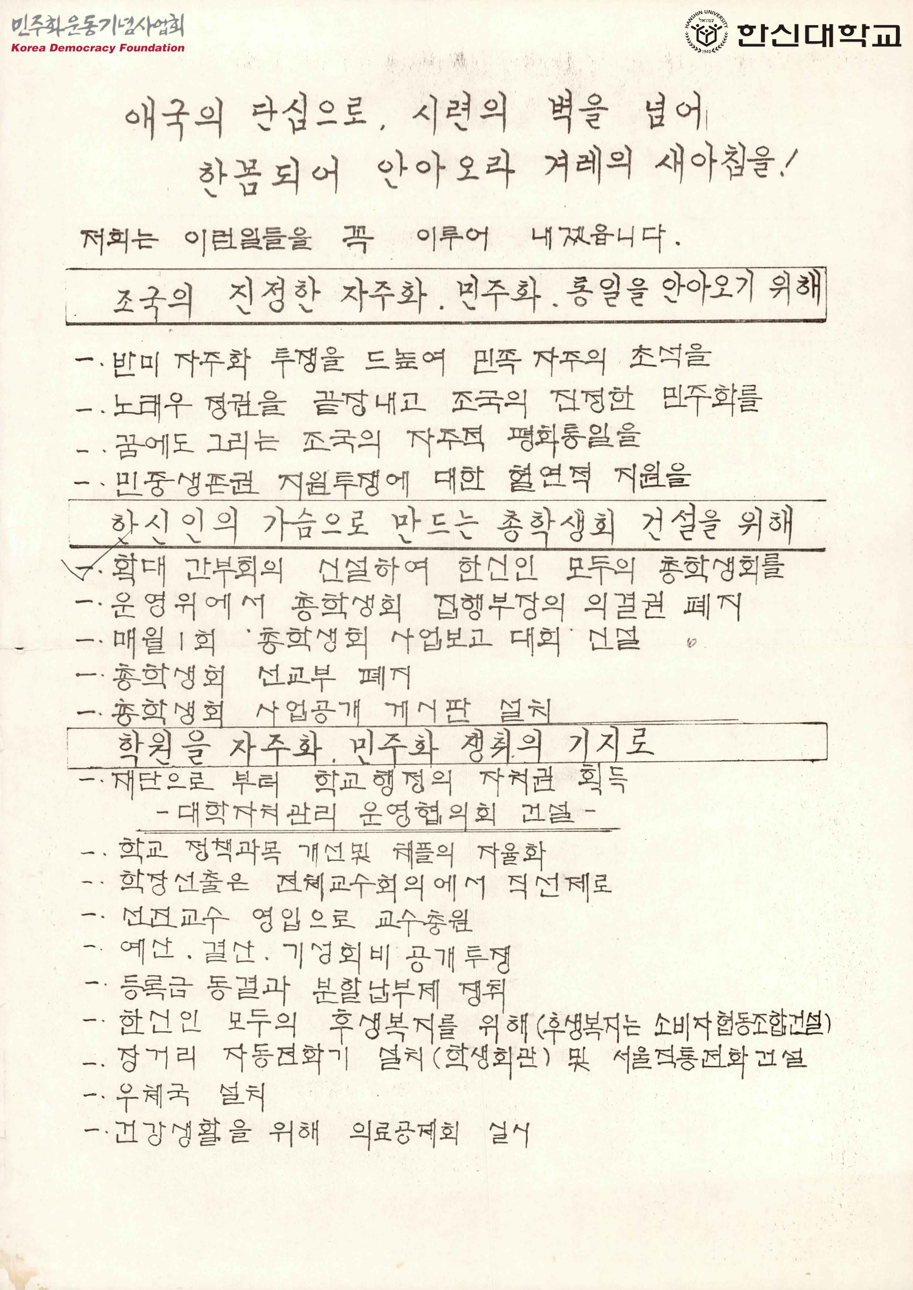 - 한신대학교 제42대 총학생회 후보들의 공약으로 목차는 다음과 같다 조국의 진정한 자주화, 민주화, 통일을 안아오기 위해 한신인의 가슴으로 만드는 총학생회 건설을 위해 학원을 자주화, 민주화 쟁취의 기지로 취업보도실을 취업상담실로 민주 총동문회와 예비역 협의회 건설에 적극지원 사회복지학부를 신설하자 써클연합회의 자주성 실현으로 솟구치는 한신문화 여성학우들의 자주성 실현과 문화공간 확보를 위해