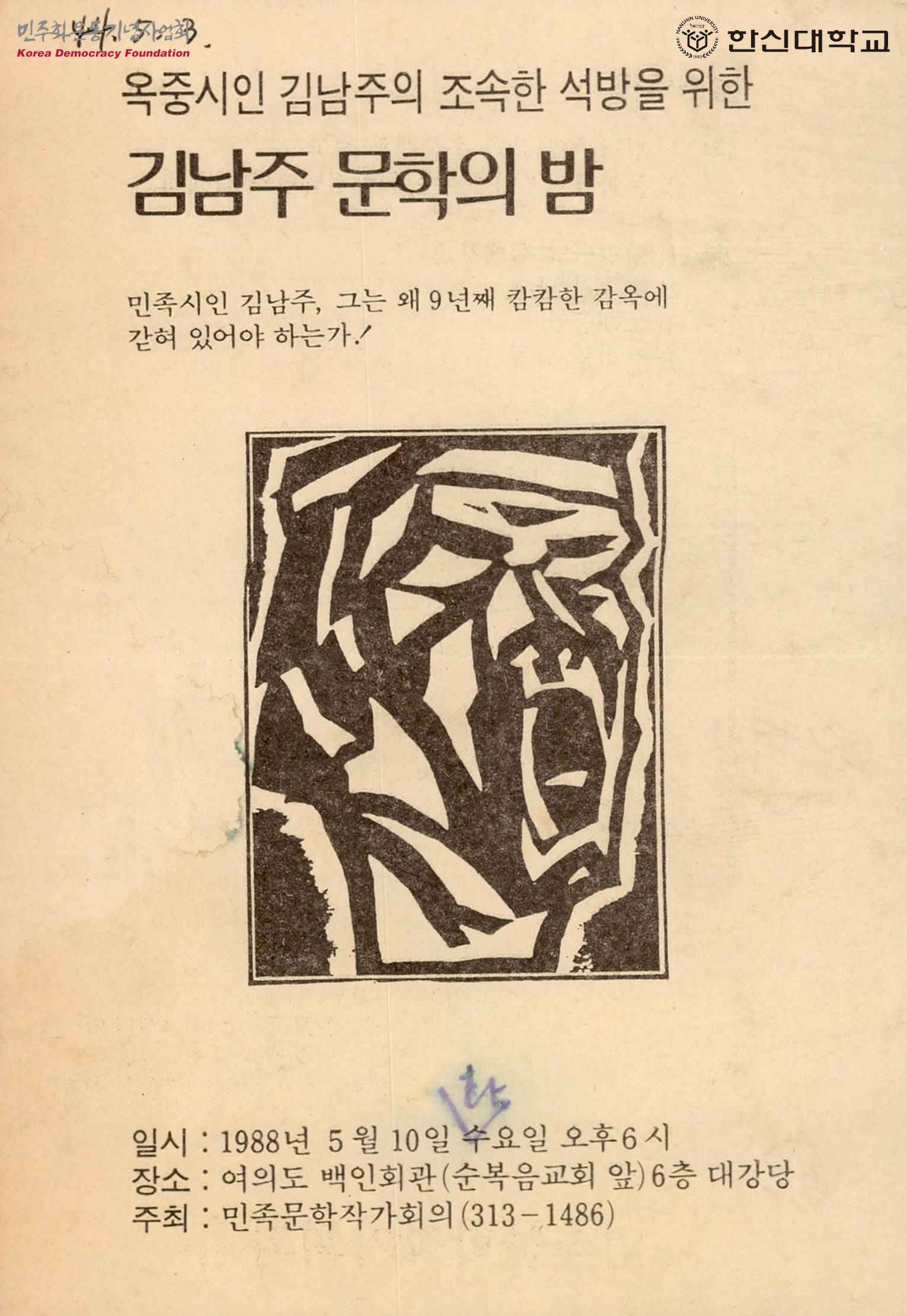 옥중시인 김남주의 조속한 석방을 위한 김남주 문학의 밤 리플릿 - 민족시인 김남주, 그는 왜 9년째 캄캄한 감옥에 갇혀 있어야 하는가!