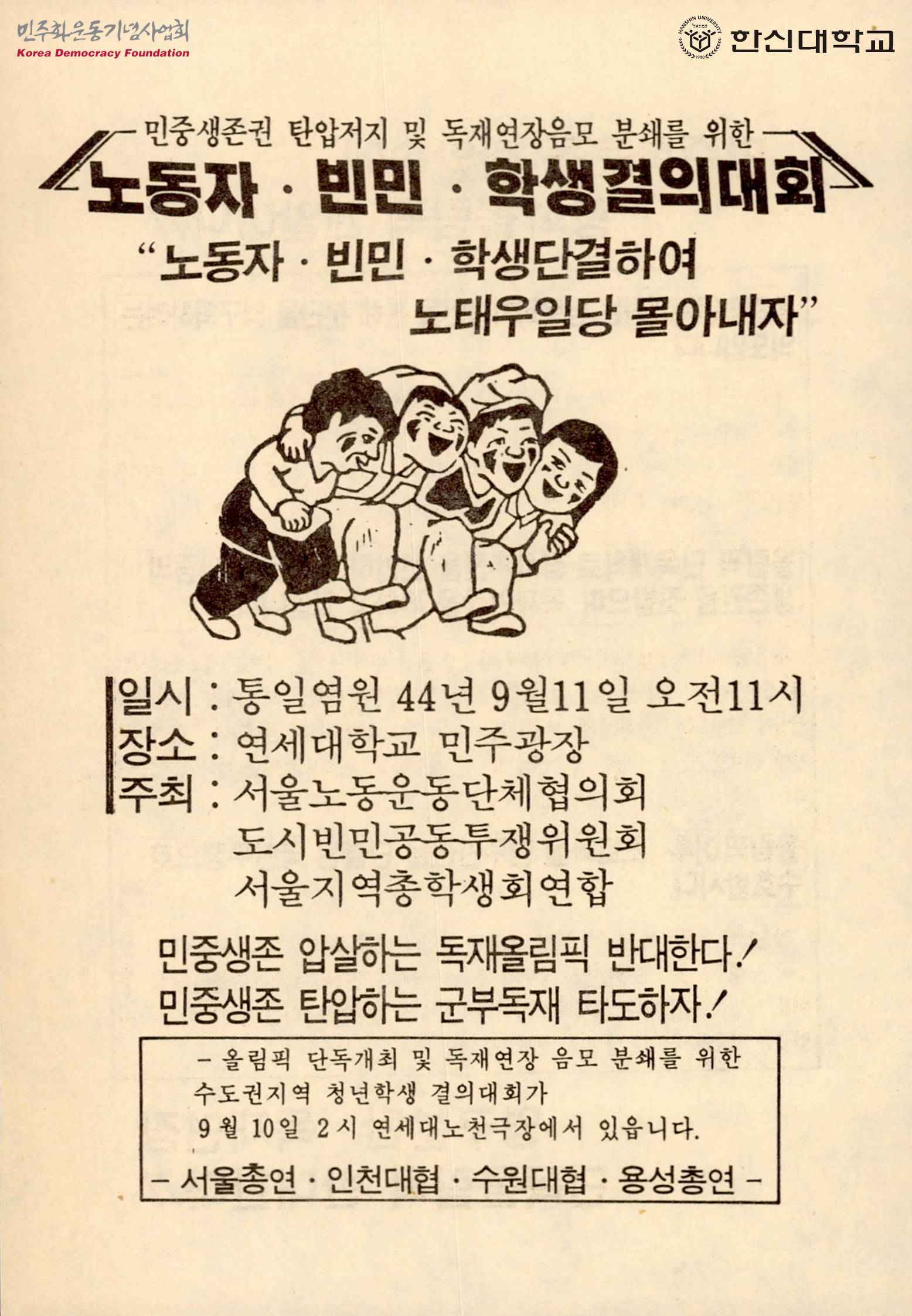민중생존권 탄압저지 및 독재연장음모 분쇄를 위한 노동자.빈민.학생결의대회 - 노동자.빈민.학생단결하여 노태우일당 몰아내자