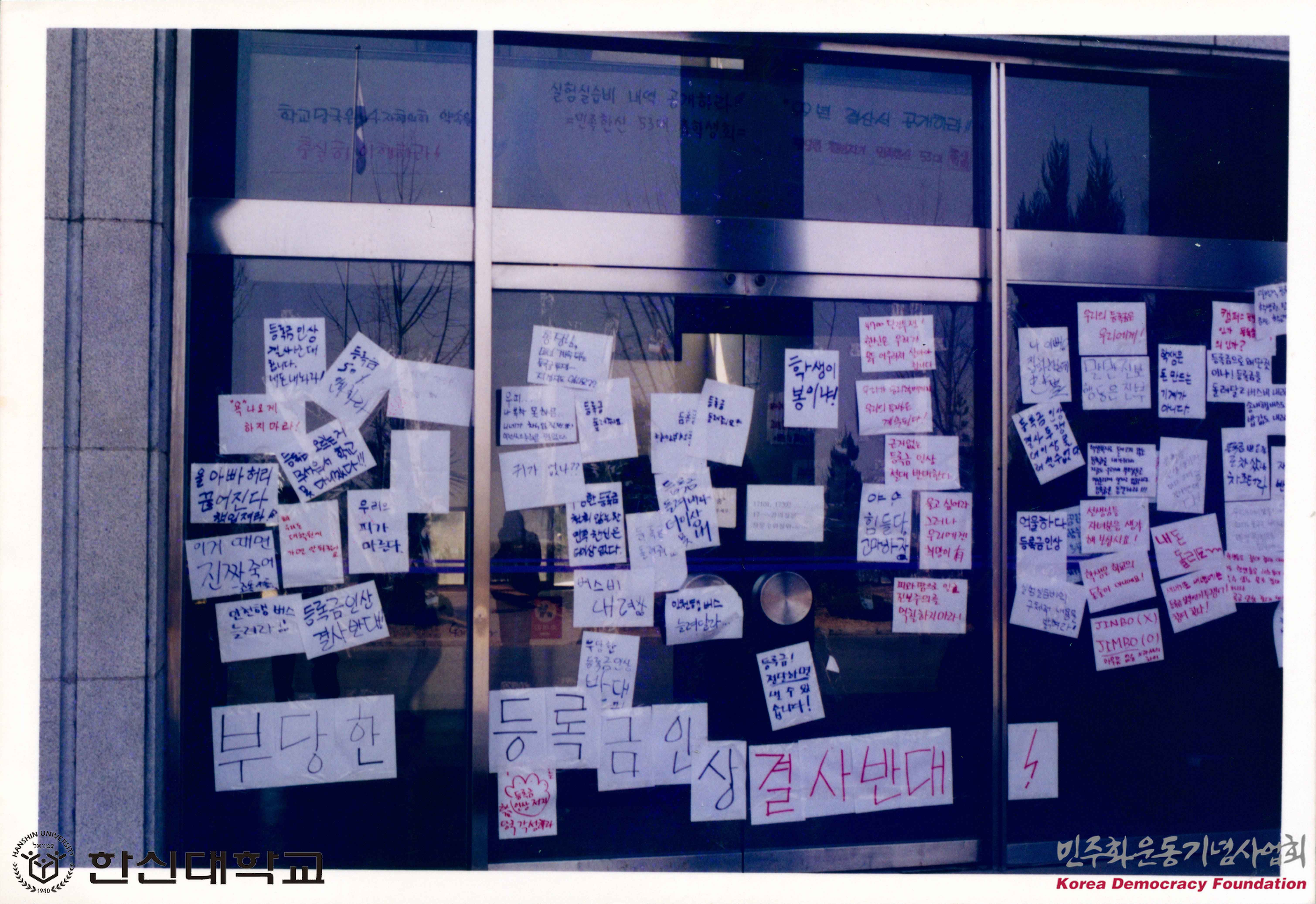 등록금 인상 반대, 총학생회 공약 이행 요구 등 2000년 한신대 전체학생대표자회의장에 걸린 자보