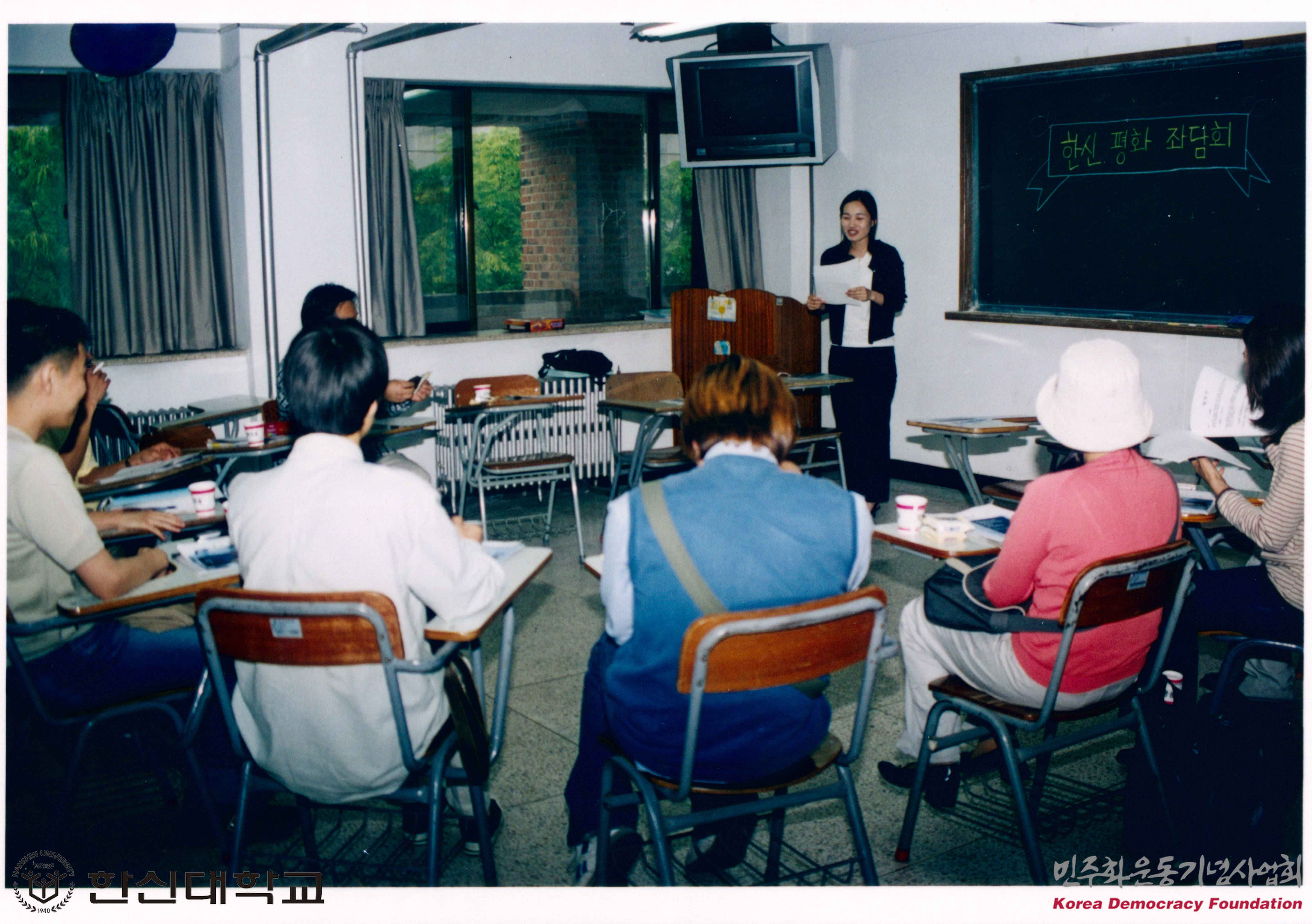 - 한신대 학생들이 "전쟁이란 무엇인가? 평화란 무엇인가?"라는 주제로 한 강의실에서 좌담회를 진행한 모습