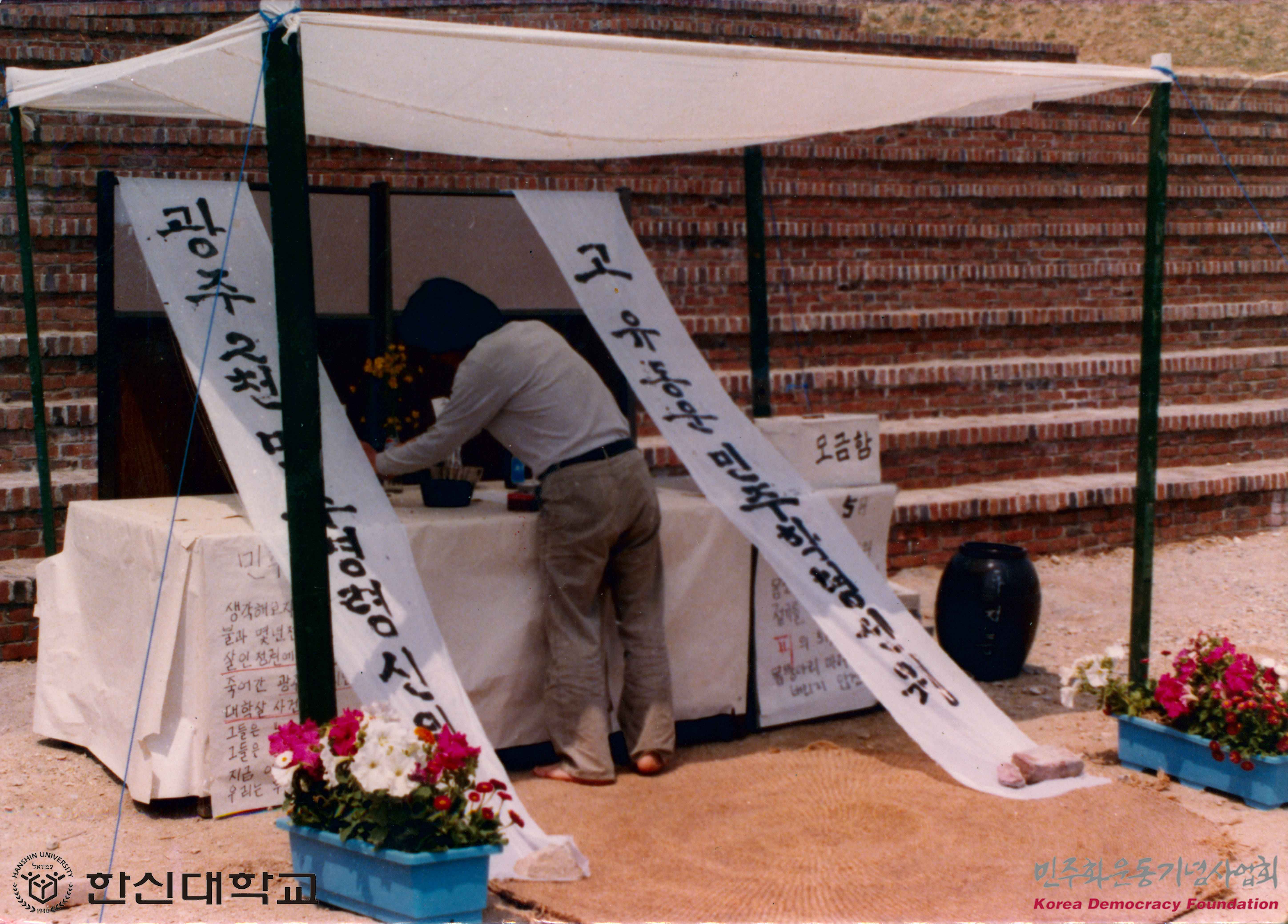 - 광주민주화운동 당시 사망한 한신대 신학과 류동운에 대한 4주기 추모제를 진행 중인 모습으로, 추모를 위해 학생들이 제단 앞에 줄지어 서있음