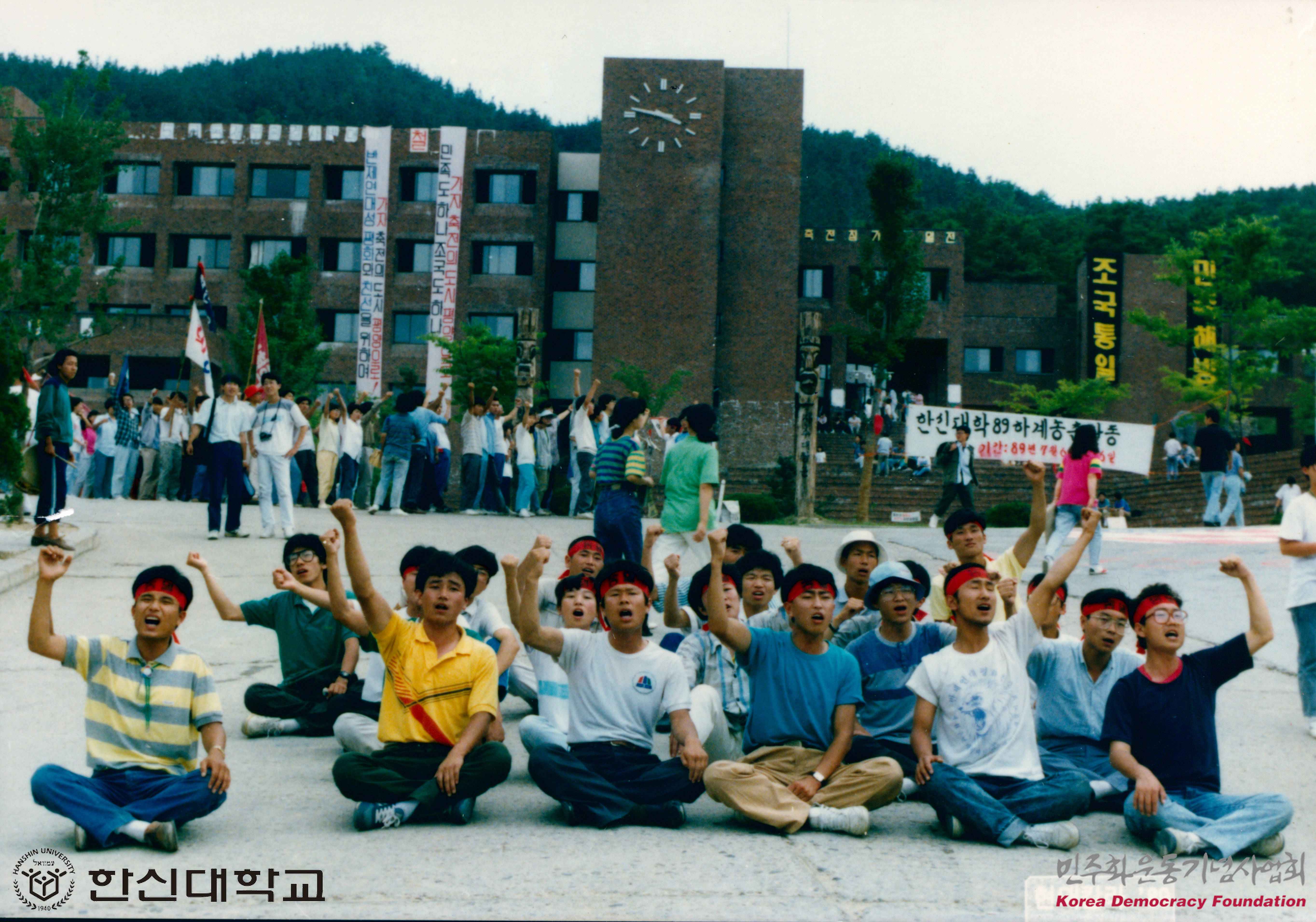 - "통일"이라 쓰여진 띠를 두른 한신대 학생들이 정문 앞 도로를 점거하고 길에 앉아 시위 구호를 제창하는 모습