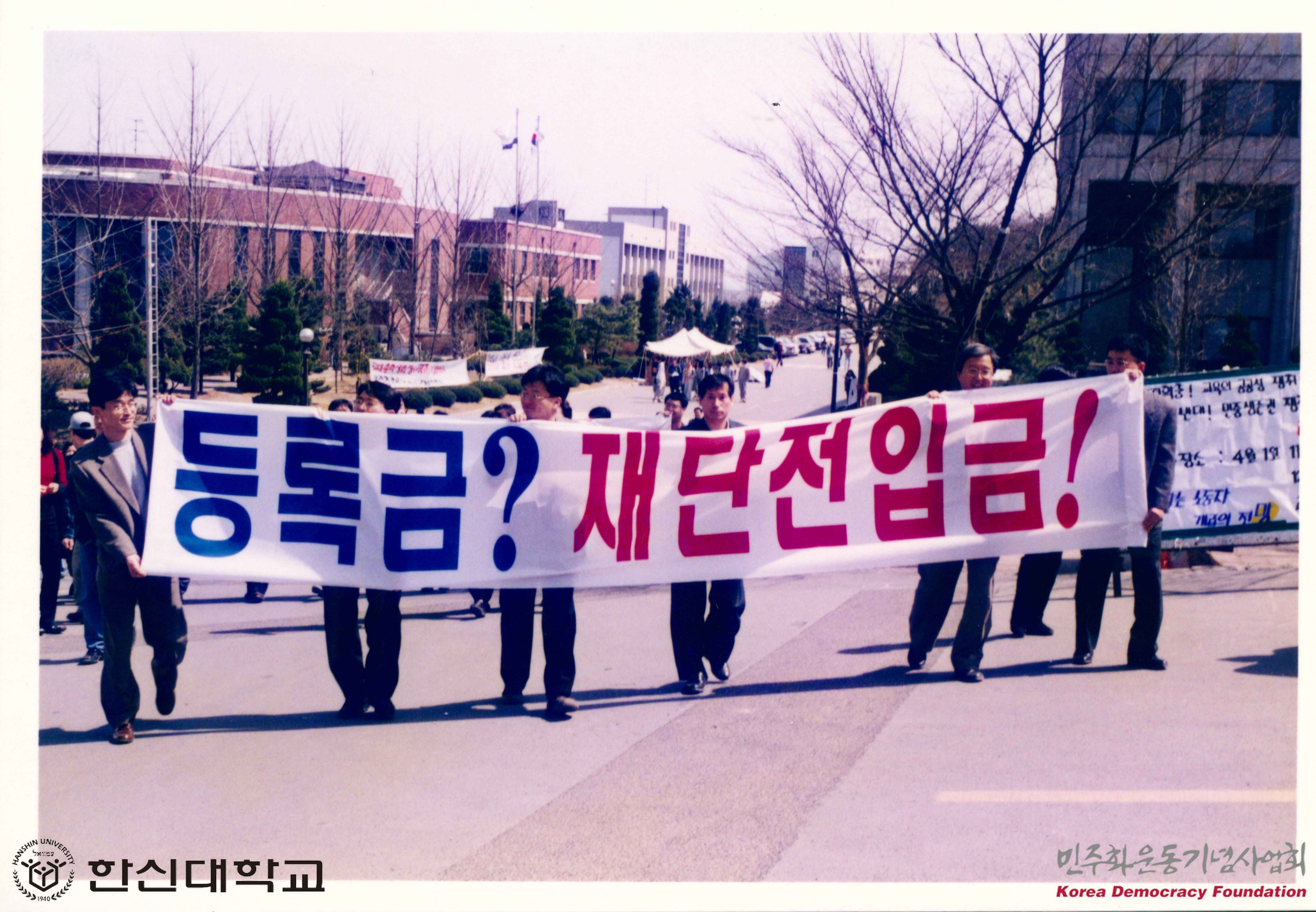 - 2000년 봄 학기 무렵 한신대 교수들이 등록금은 재단전입금이라는 내용의 현수막을 들고 교정을 행진하는 모습