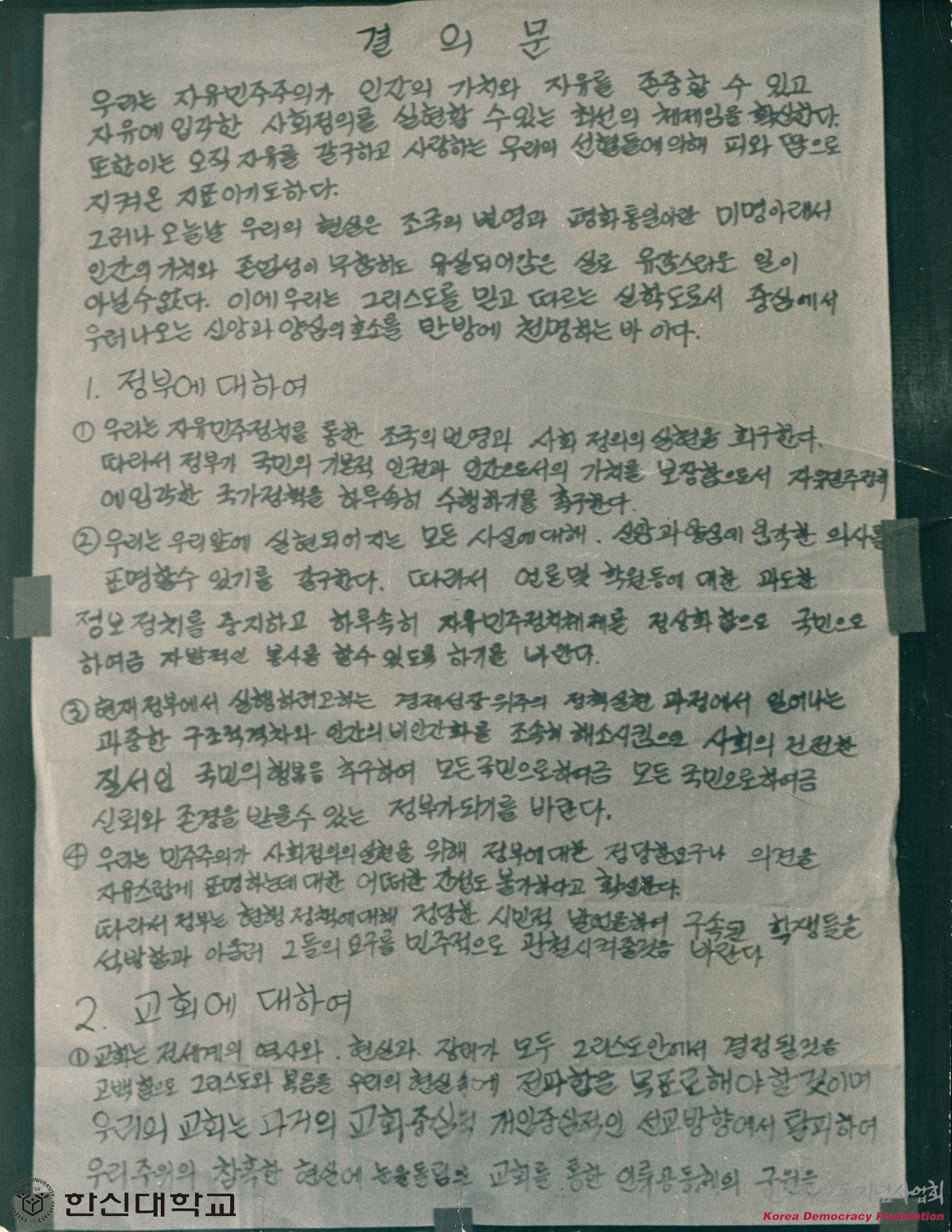 - 자유민주주의에 입각해 정부에 민주적인 정치를 해달라고 부탁하는 내용과 교회에 불의와의 투쟁을 요구하는 내용 및 사람들에게 투쟁을 호소하는 내용을 담은 결의문을 찍은 사진