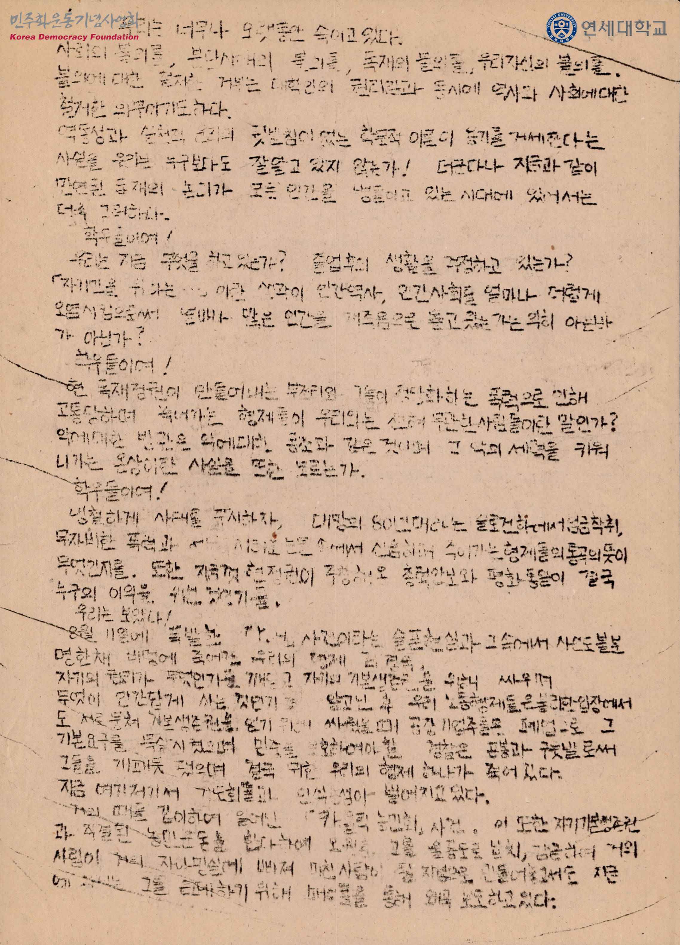 - 노동자들의 사람답게 살기 위한 투쟁을 짓밟는 정권을 비판하고 김경숙의 죽음을 말하며 학우들에게 노동자와 농민의 기본인권과 기본생존권 보장, YH사건과 가톨릭농민회 사건 등을 왜곡없이 보도하라 등의 구호를 내건 투쟁에 함께하자고 말하는 내용의 문서