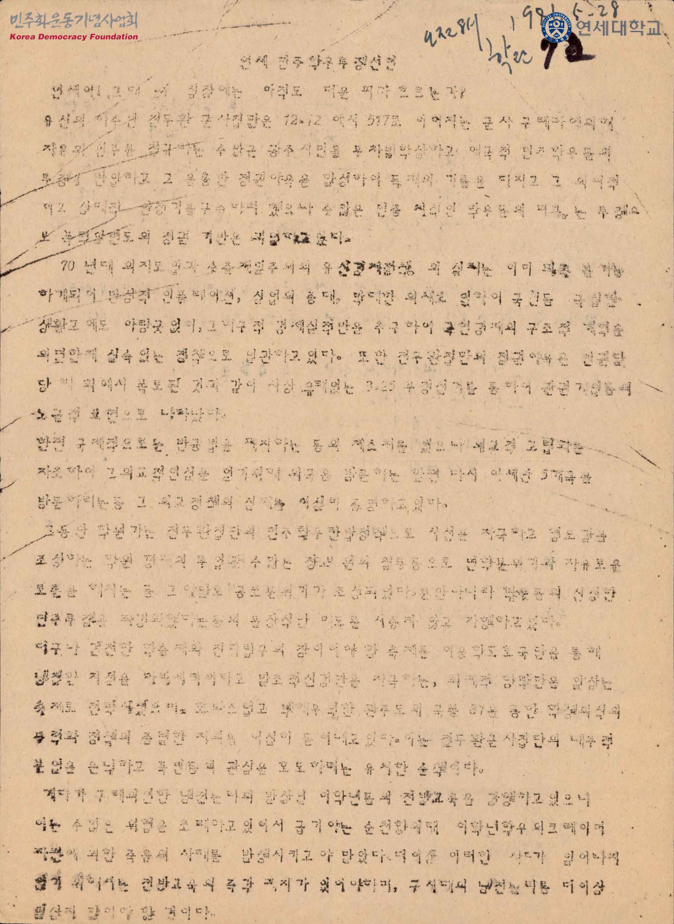 - 민주화를 짓밟는 전두환 정권을 비판하며 연세대는 민주투쟁의 대열에 동참할 것을 결단하며 전두환은 광주사태의 책임을 지고 즉각 물러가라는 것, 언론통제를 금지하라는 것, 학내감시를 즉시 몰아내라 등을 주장하는 문서