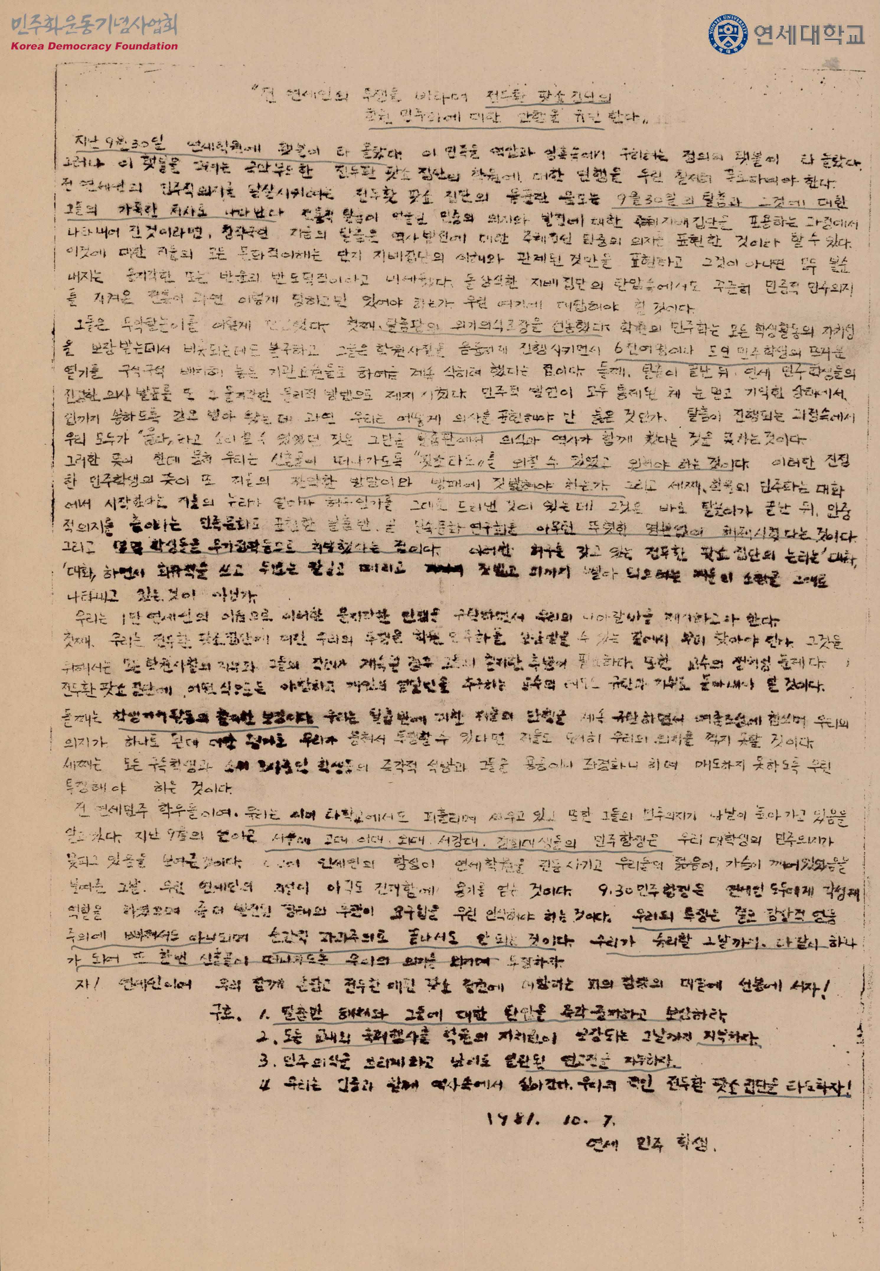 - 전두환 정권의 만행을 규탄하면서 팟쇼집단에 대한 투쟁은 학원민주화를 앞당길 수 있는 길에서 찾아야 한다는 것과 학생자치활동의 철저한 보장을 요구하는 내용의 문서