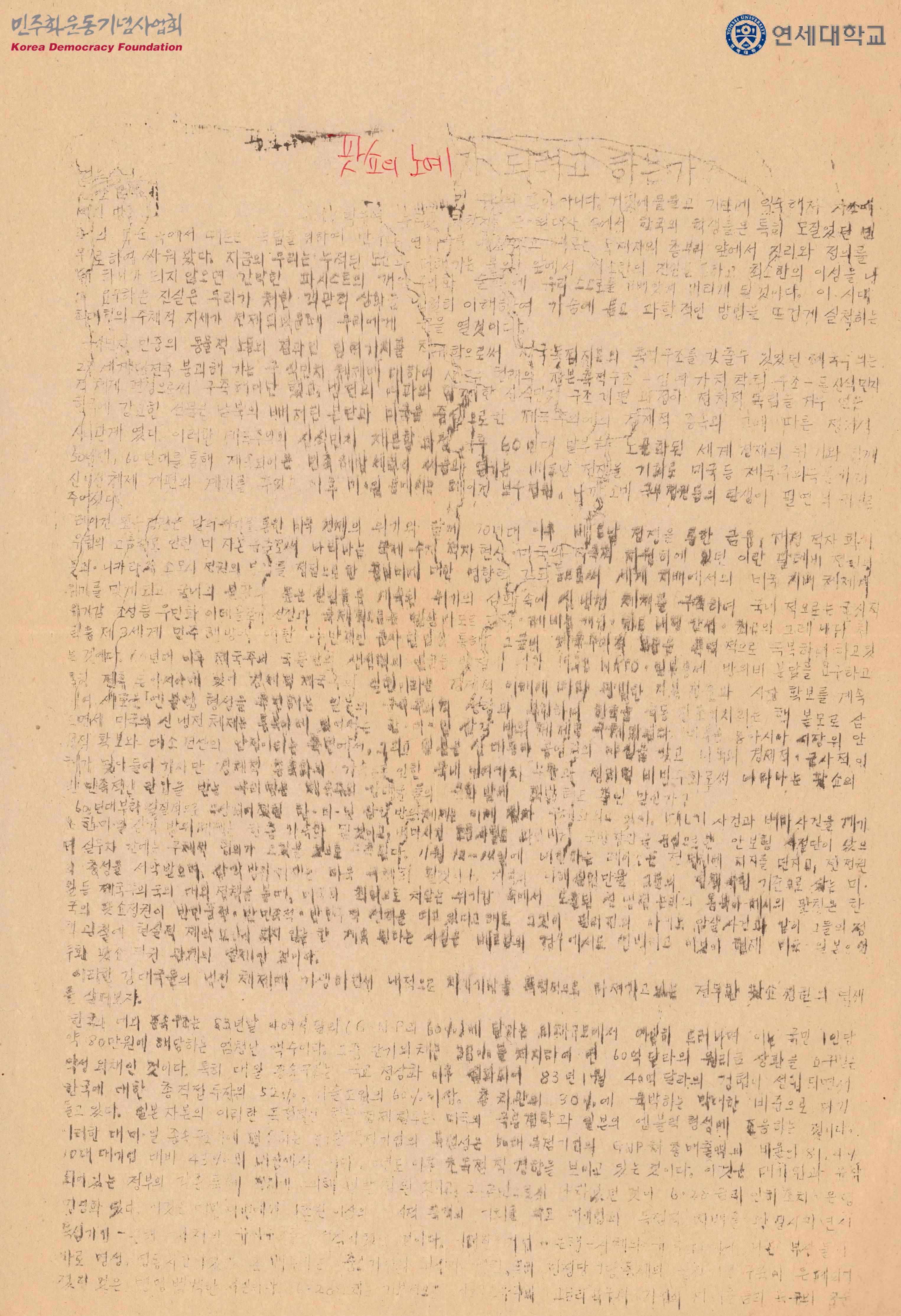 - 강대국의 냉전체제에 기생하며 내적으로 자기기반을 폭력적으로 다지고 있는 전두환 정권에 대한 비판의 내용이 실린 글로 이에 따른 연세대 학우들의 투쟁결의와 전두환 팟쇼정권에 대한 경고의 내용이 적힌 문서