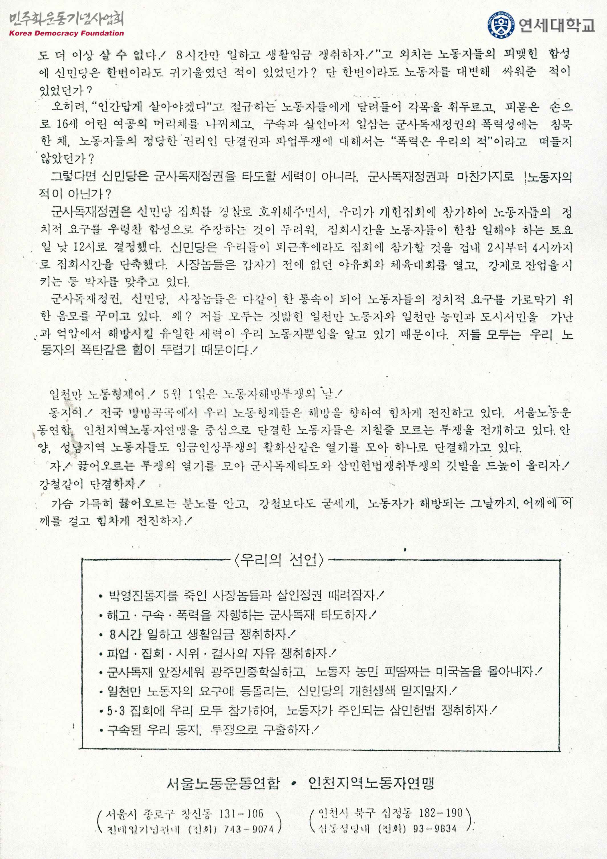 일천만 노동자의 손으로 군사독재정권 타도하고, 삼민헌법 쟁취하자!