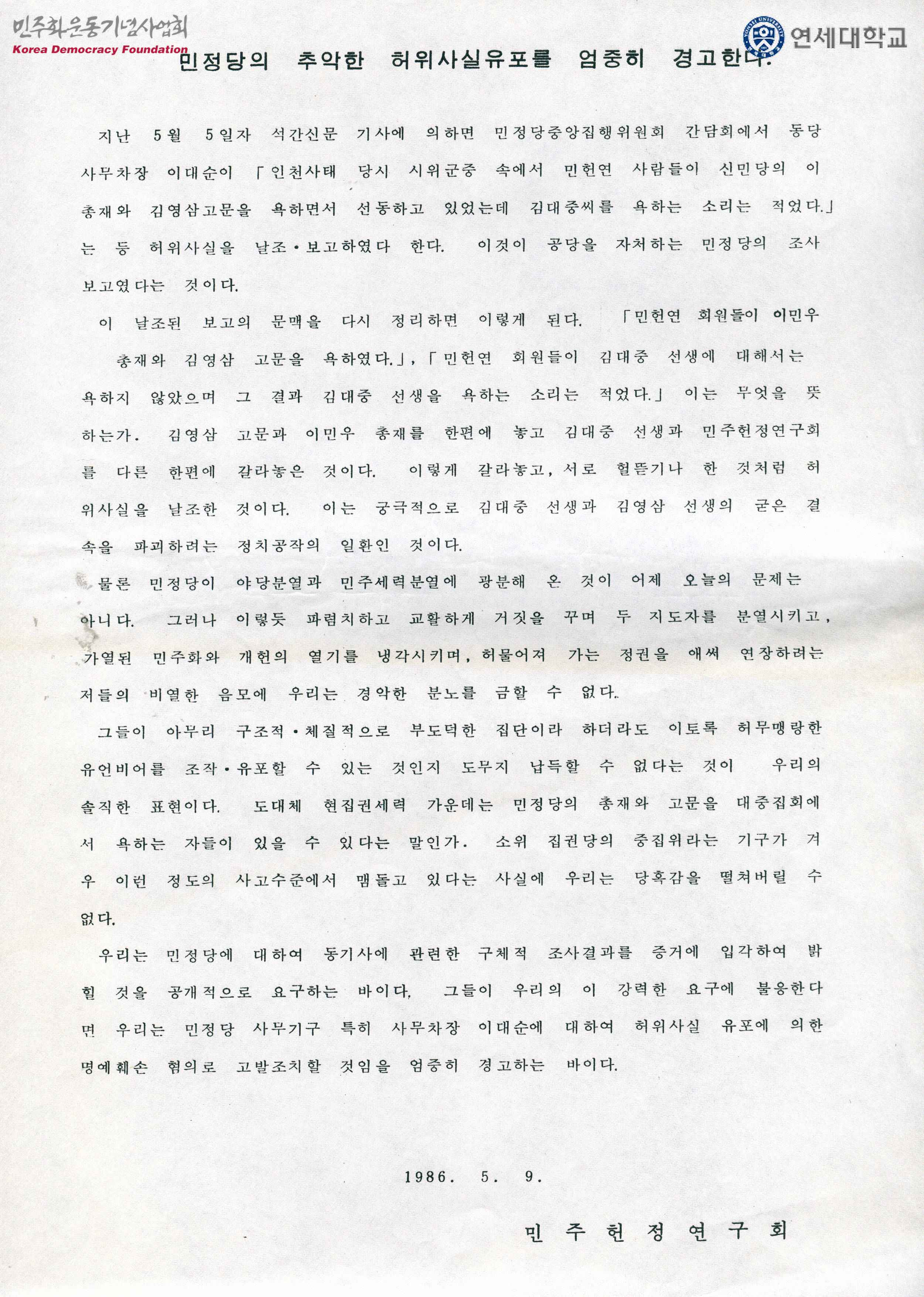 - 민정당의 사무차장인 이대순이 김대중과 김영삼의 결속을 약화시키려는 목적으로 허위사실을 유포한 것에 대해 명예훼손 혐의로 고발할 것이라는 내용을 담은 유인물