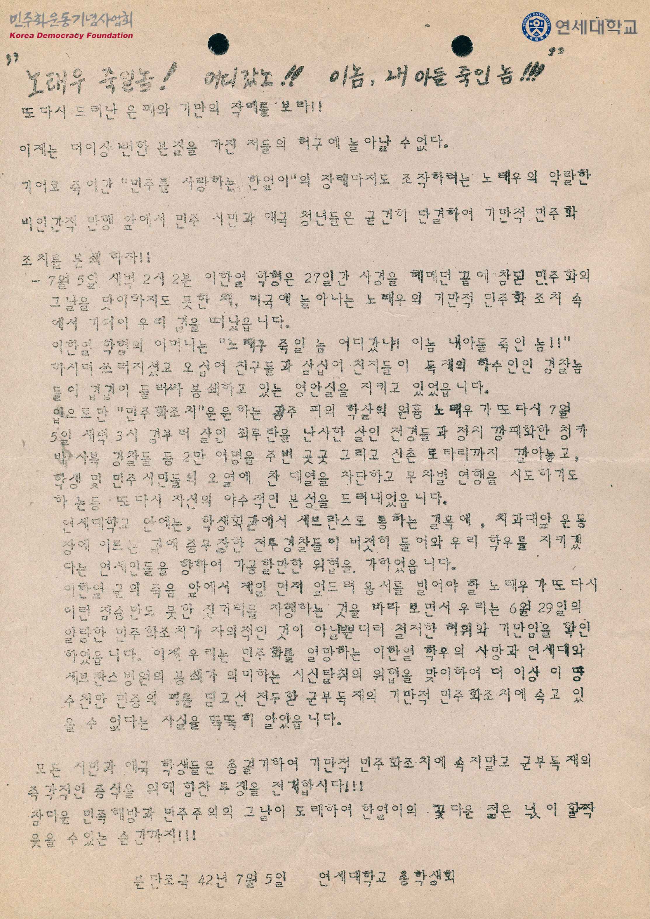 - 이한열 열사의 장례식을 조작하려고 하며 기만적인 민주화 조치에 속지 말고 독재정권을 종식시켜 진정한 민족해방과 민주주의를 이룰 때까지 총궐기하자는 내용을 담은 유인물