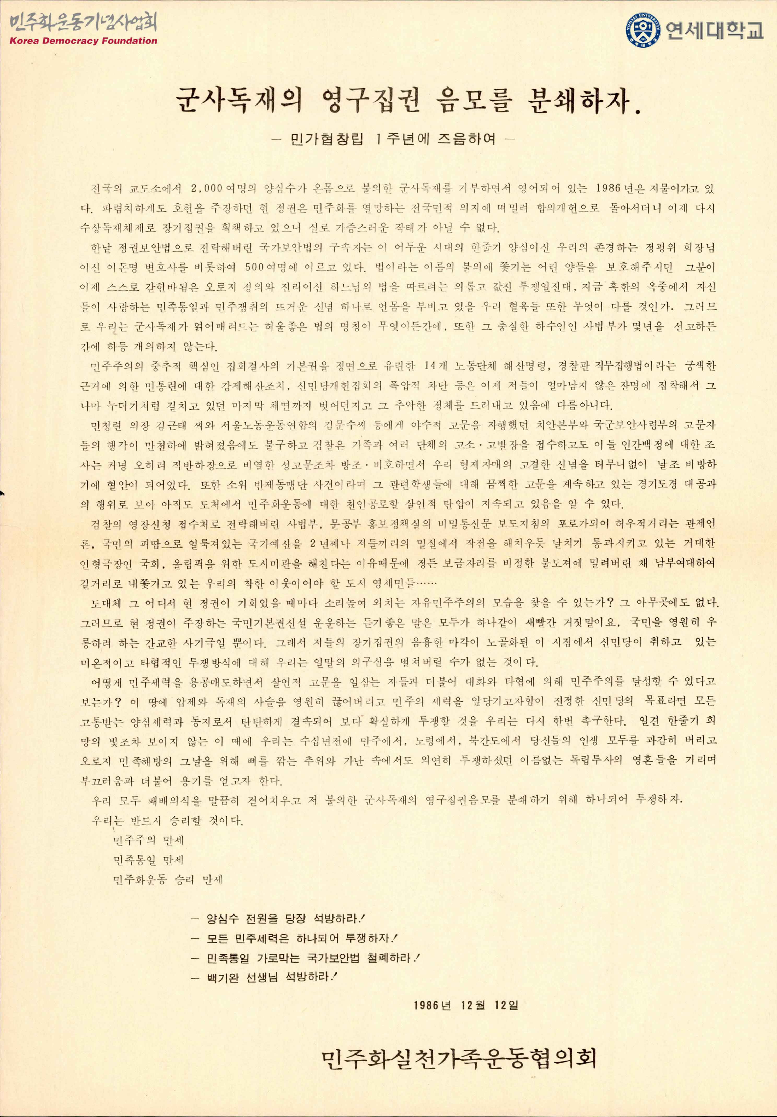 군사독재의 영구집권 음모를 분쇄하자. - 민가협창립 1주년에 즈음하여 -