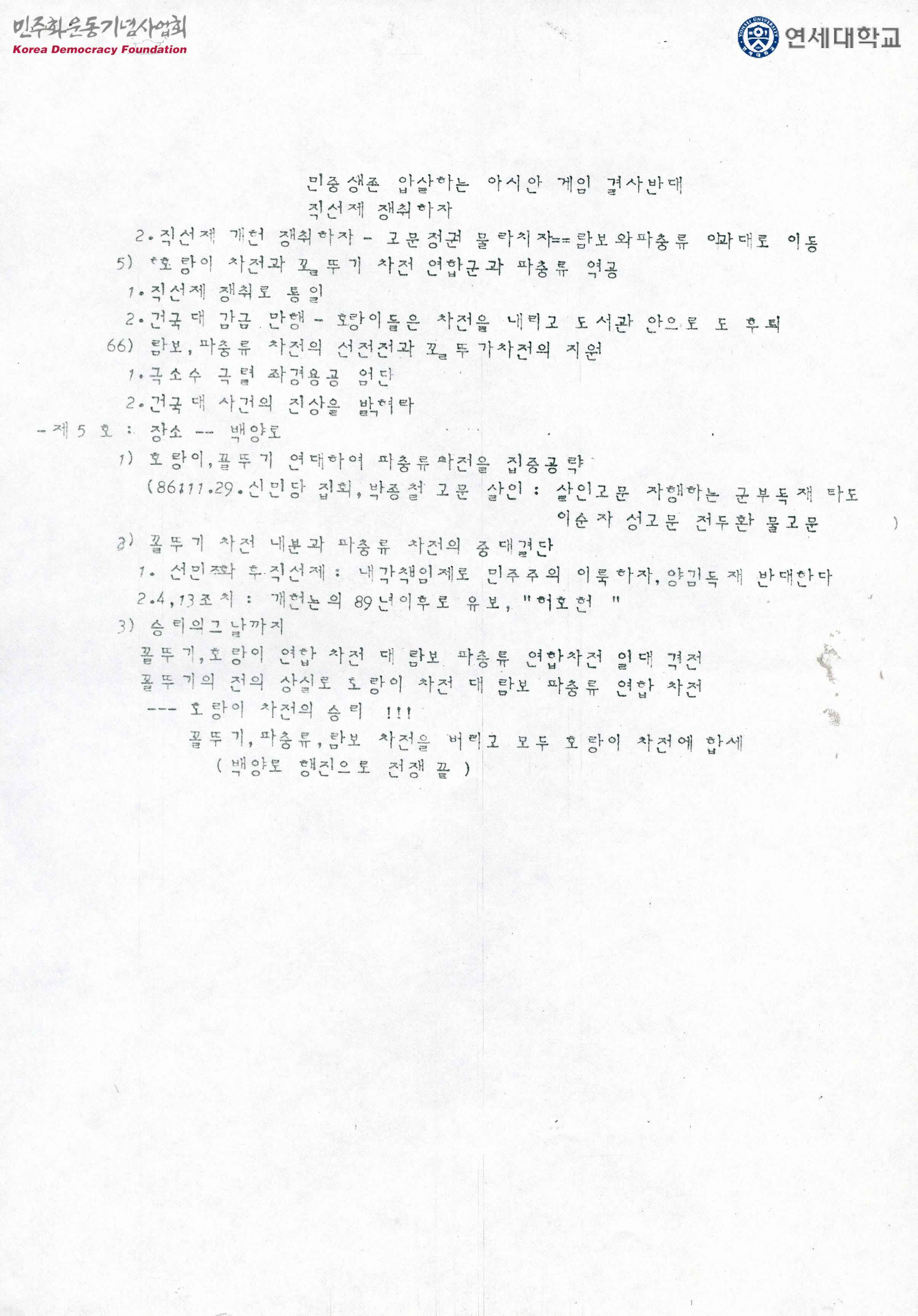 - 5월 8일 실시될 연세대 민주화 시위의 전개방식 등에 대한 내용을 담은 유인물
