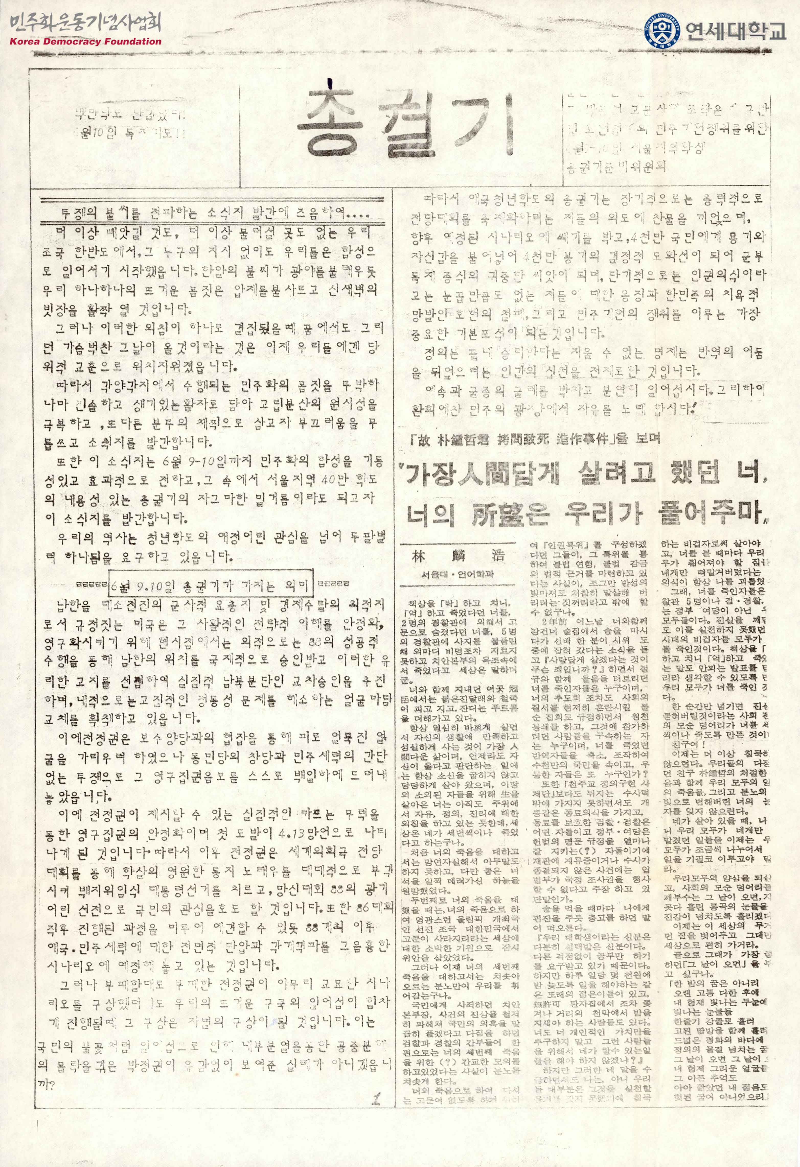 - 4.13 호헌철폐, 민주개헌의 쟁취를 위한 민주의 광장에서 단결하여 투쟁하자는 내용을 포함한 유인물