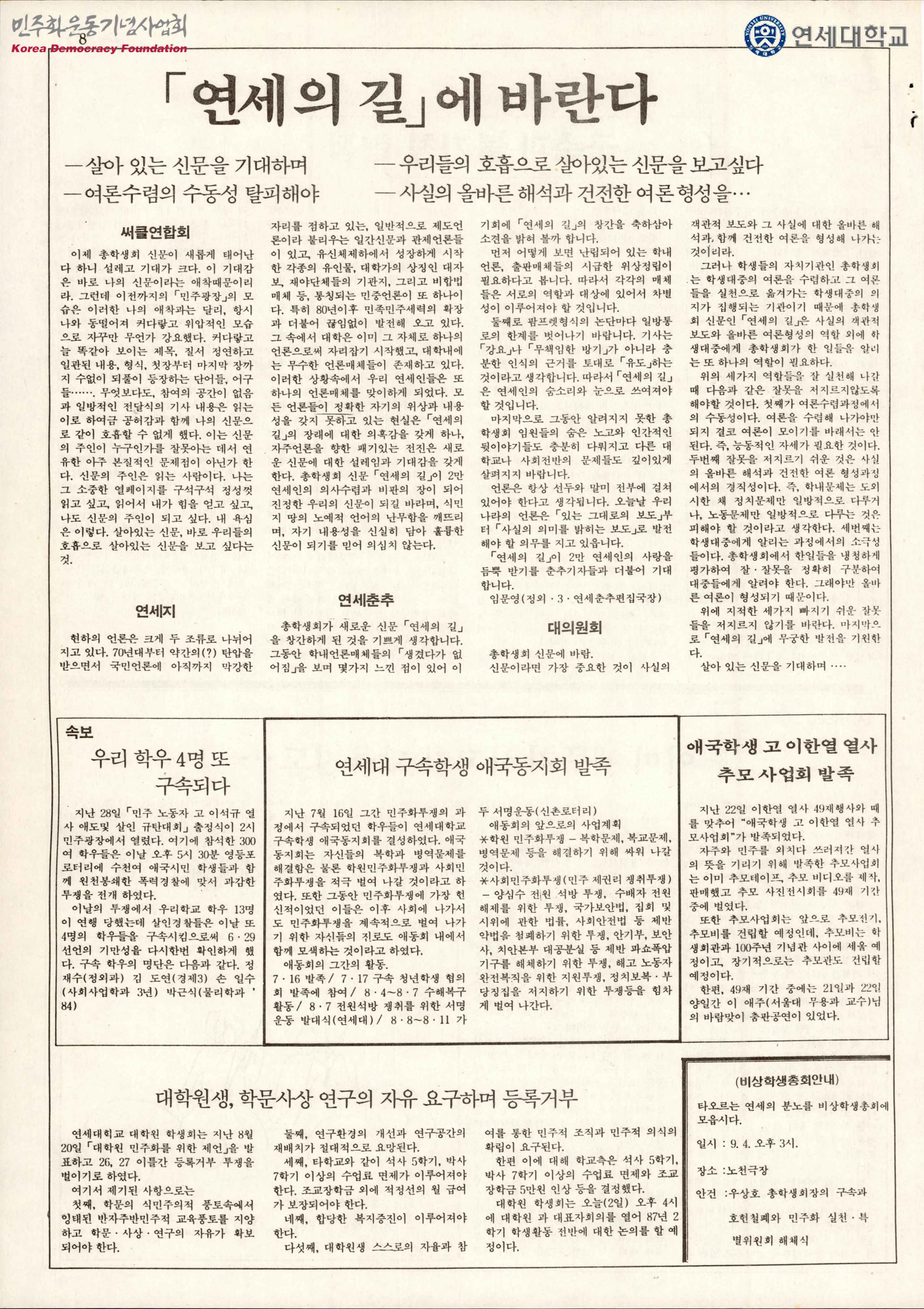 - 이한열 열사 죽음에 대해 항의하던 연세대학교 총학생회장 우상호의 석방 요구, 이한열 열사에 대한 추모글, 노동운동, 9월 4일 비상학생총회 안내 등 내용이 담긴 발간자료