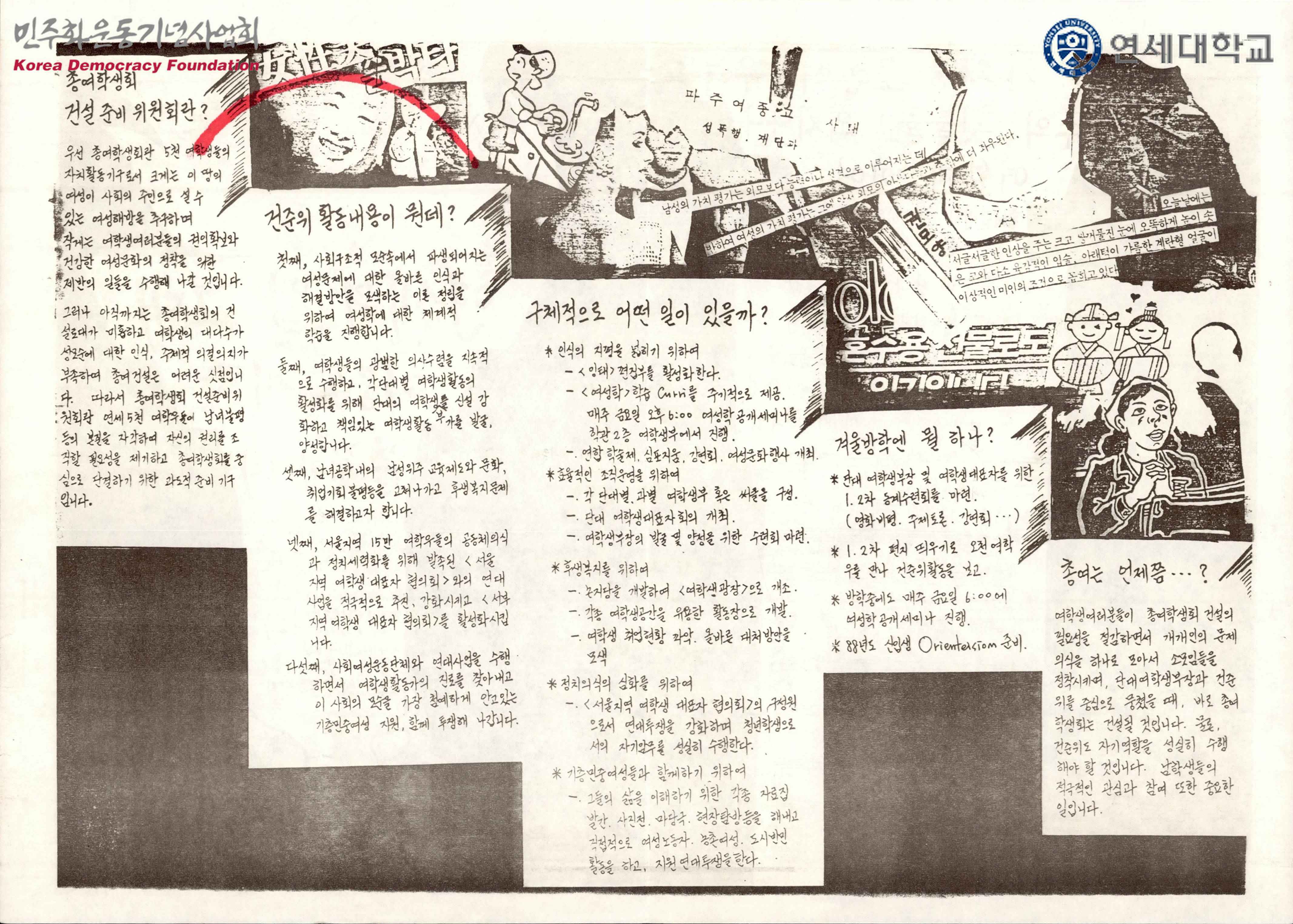 - 여성들의 권익 향상을 위해 활동하는 총여학생회 건설준비위원회 발족식 개최를 홍보하는 내용이 포함된 유인물