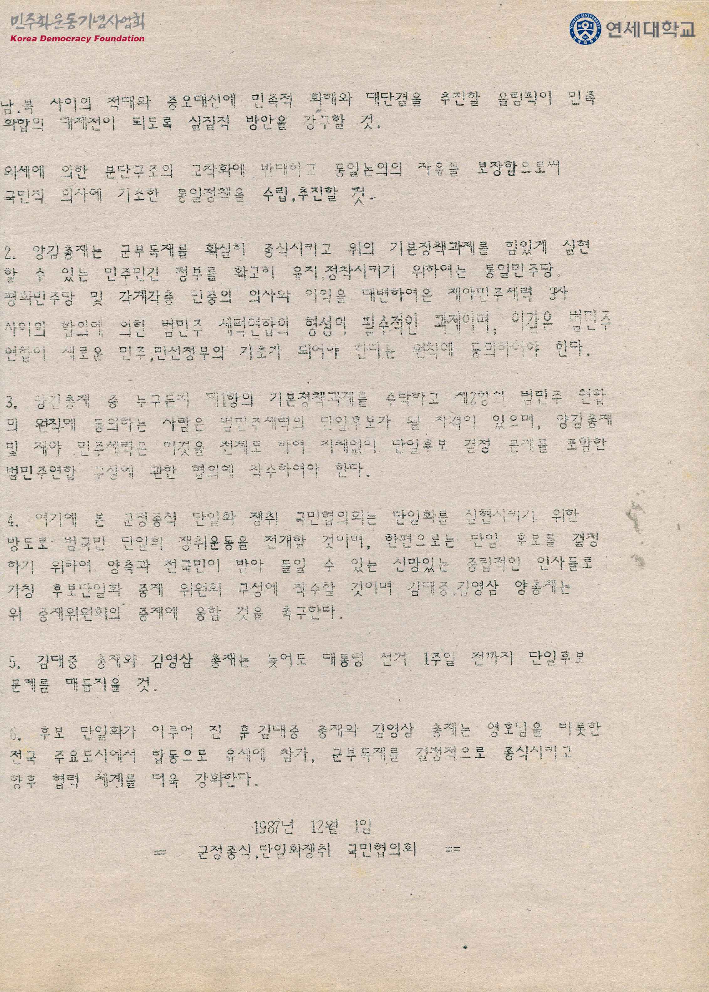 - 군부독재 세력의 청산을 위해 김대중, 김영삼 두 민주 세력이 단일화하여 민주정부를 수립하였을 때 정책의 기본원칙에 대한 내용을 담은 유인물