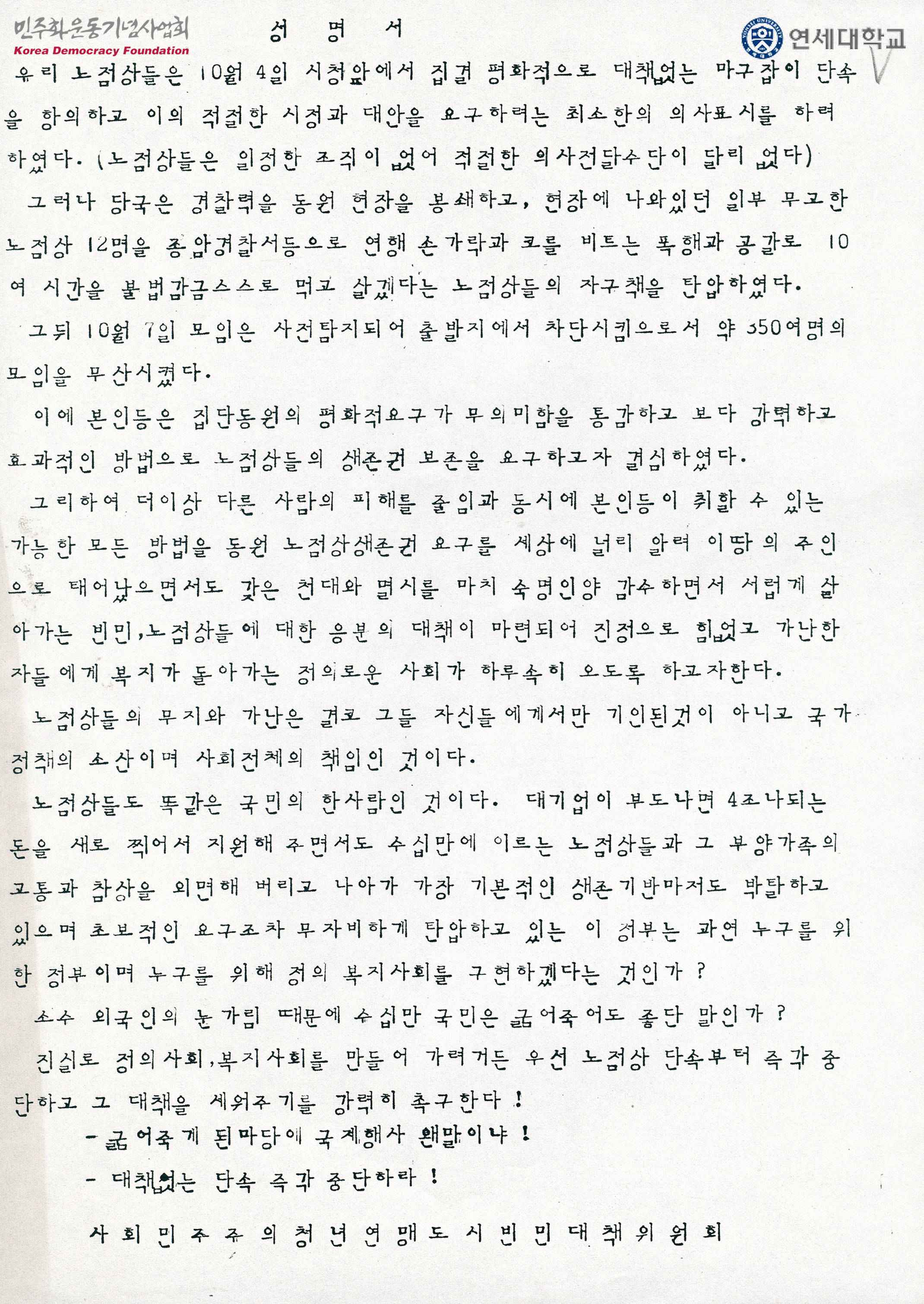 - 소수의 외국인(IMF, IBRD)의 눈가림을 위해 수십만 국민과 노점상을 굶어 죽게 만드는 정부는 노점상 단속부터 즉각 중단하고 대첵을 세워주기를 촉구하는 문서로 이에 대한 노점상인들의 요구가 적혀있음