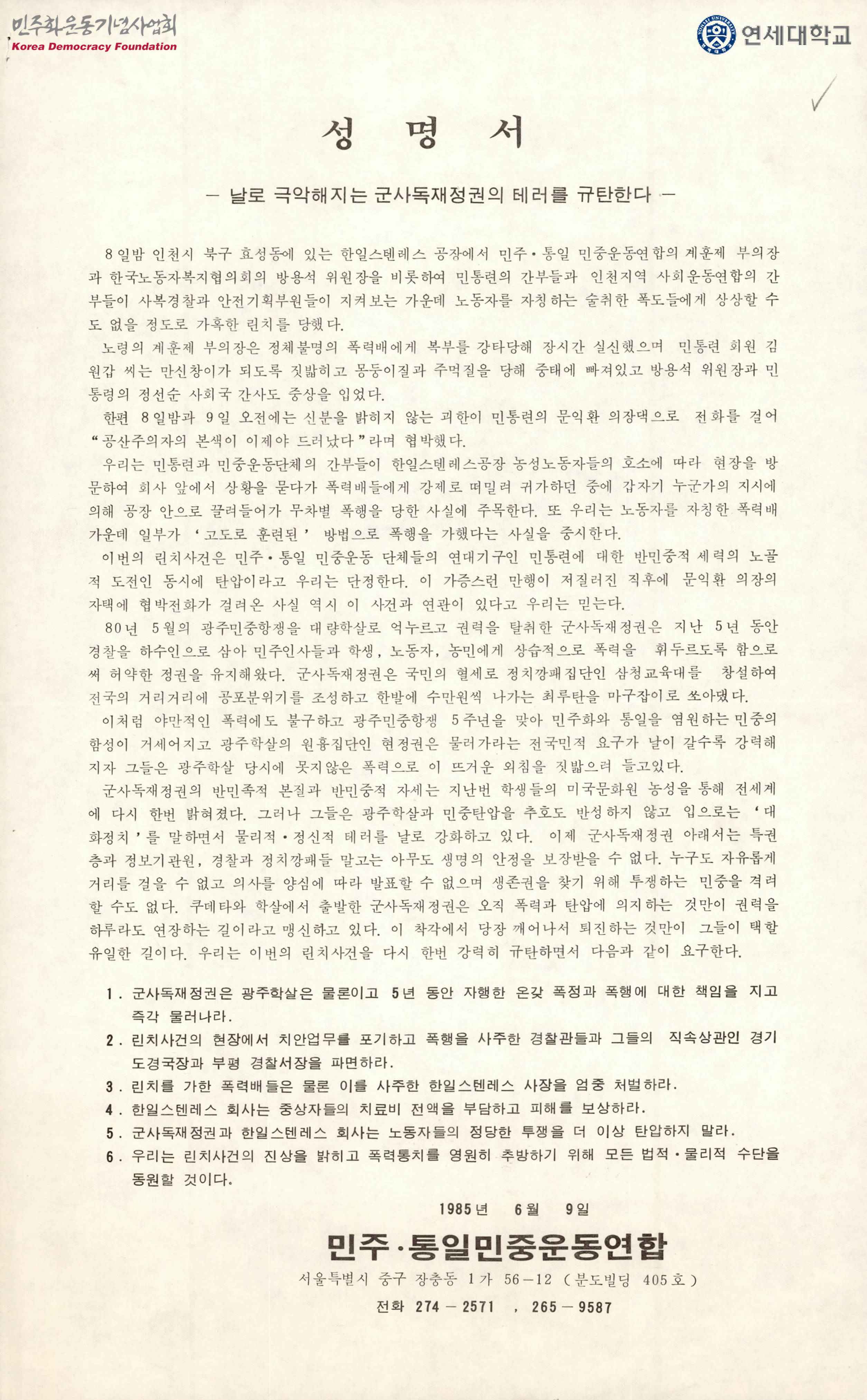 성명서 - 날로 극악해지는 군사독재정권의 테러를 규탄한다 -