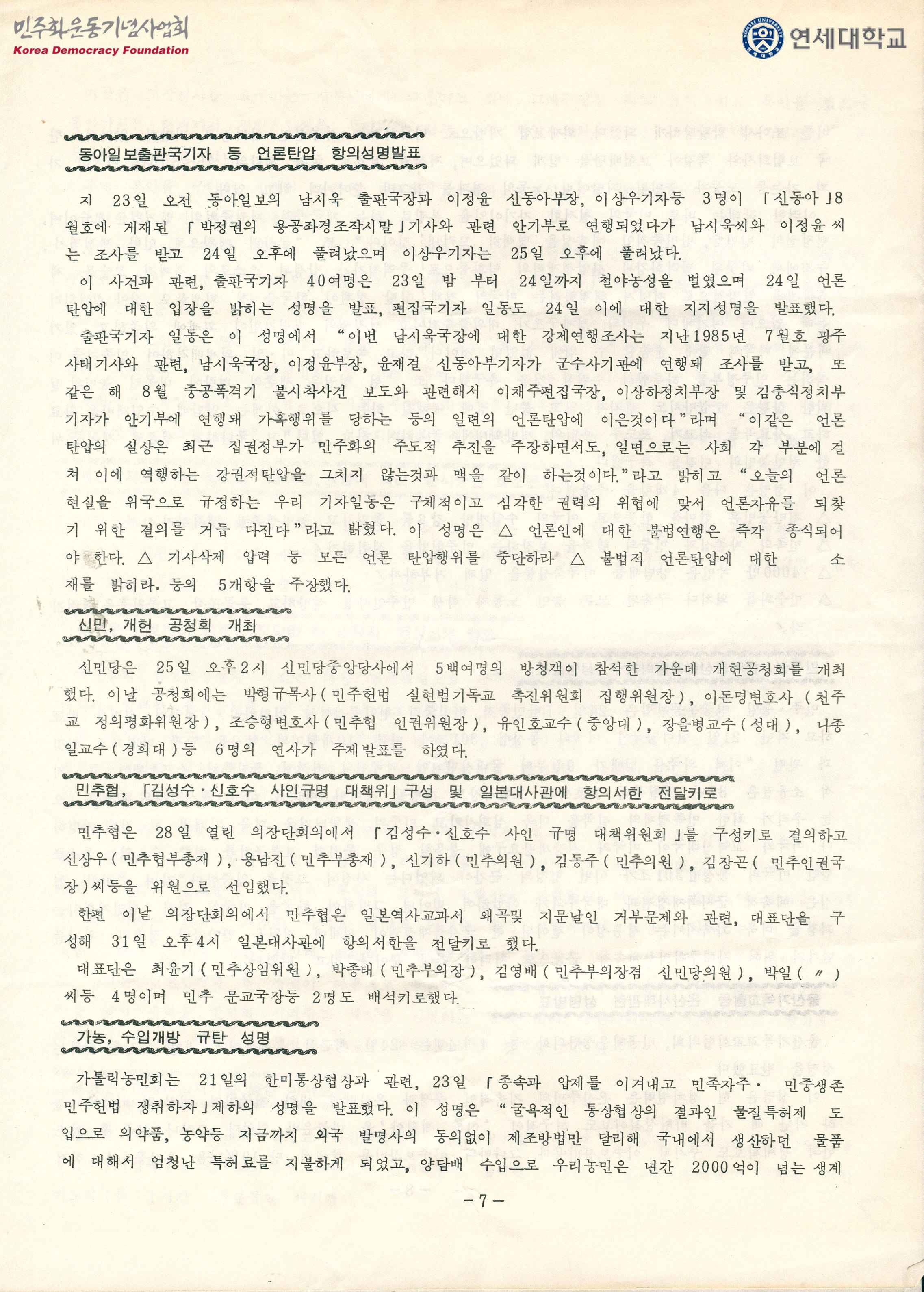 - 23일부터 31일 사이 있던 민주화 관련 사건의 모음집으로 내용을 다음과 같음 동아일보출판국기자 등 언론탄압 항의성명발표 신민, 개헌 공청회 개최 민추협, 김성수·신호수 사인규명 대책위 구성 및 일본대사관에 항의서한 전달키로 가농, 수입개방 규탄 성명 민통련, 한미통상협정철회촉구 성명발표 울산기독교협 등 온산사태관련 성명발표 개신교지도자·양 김씨등 20여명, 권양에 격려·단식중단 호소문 보내 성고문 성토하다 강제 사직당한 한 공직자, 양심선언 발표 성고문·인권탄압저지를 위한 미사드려 공안당국, 성의도구화사례조작 발표 민교협 등 6개 단체농성-유상덕 씨 등의 즉각 석방촉구 성명