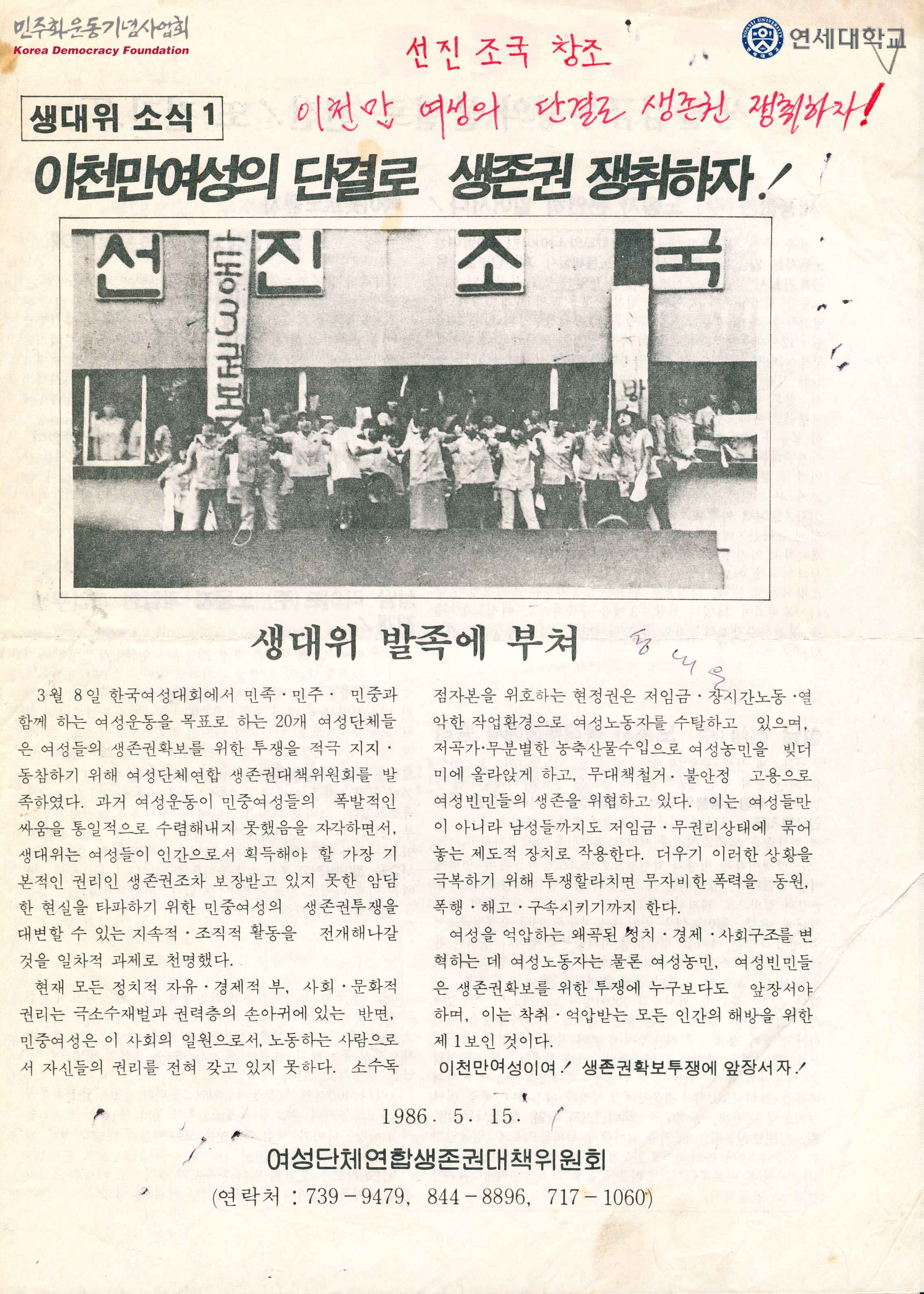 - 노동자들의 농성·파업 사례, 민중생존권에 대한 전두환 정권의 폭력, 농민들의 대규모집회와 시위, 여성노동자들의 투쟁에 지지·동참한다는 결의 등을 알리는 여성단체연합생존권대책위원회(생대위)의 소식지