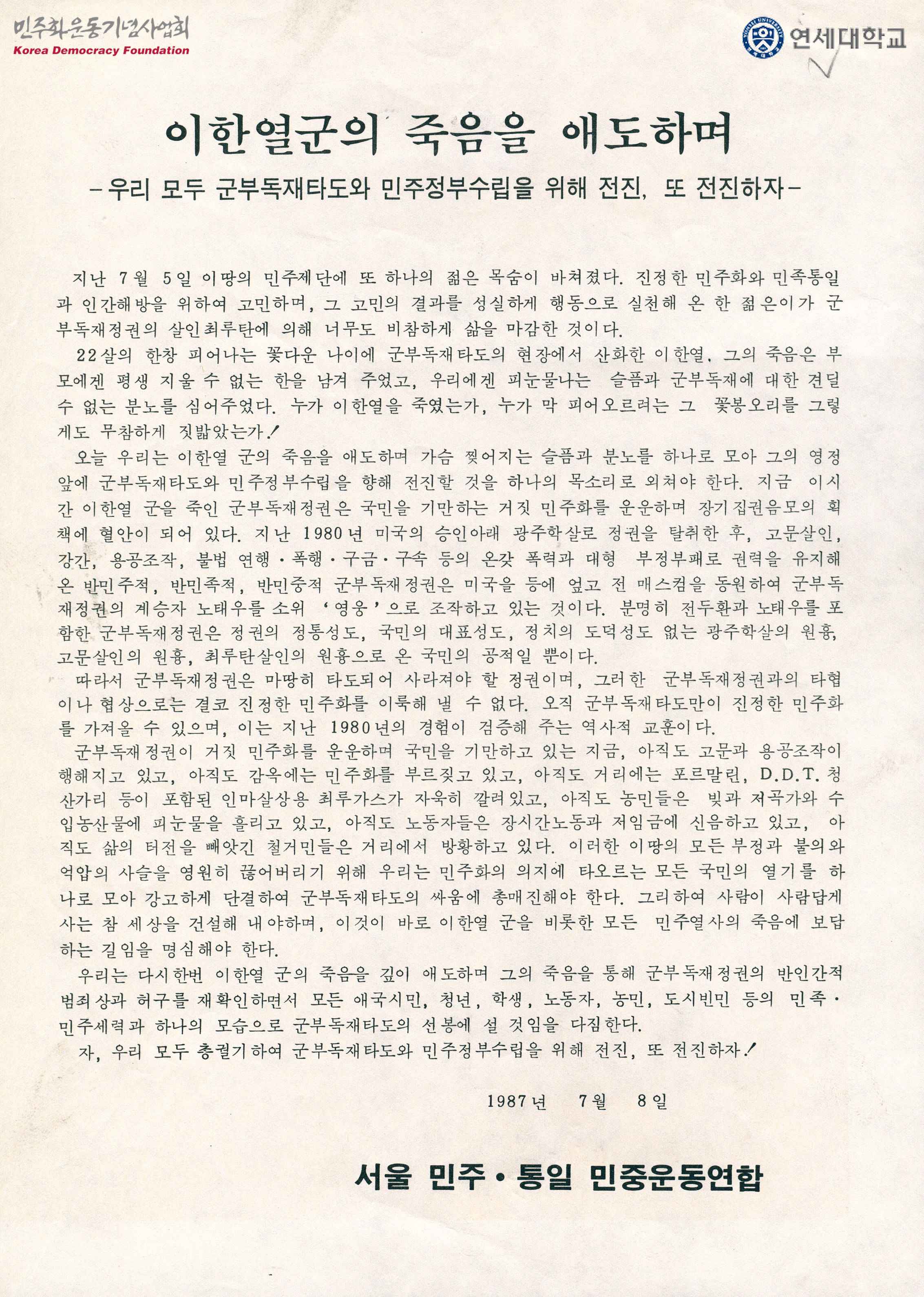 이한열군의 죽음을 애도하며 - 우리 모두 군부독재타도와 민주정부수립을 위해 전진, 또 전진하자 -