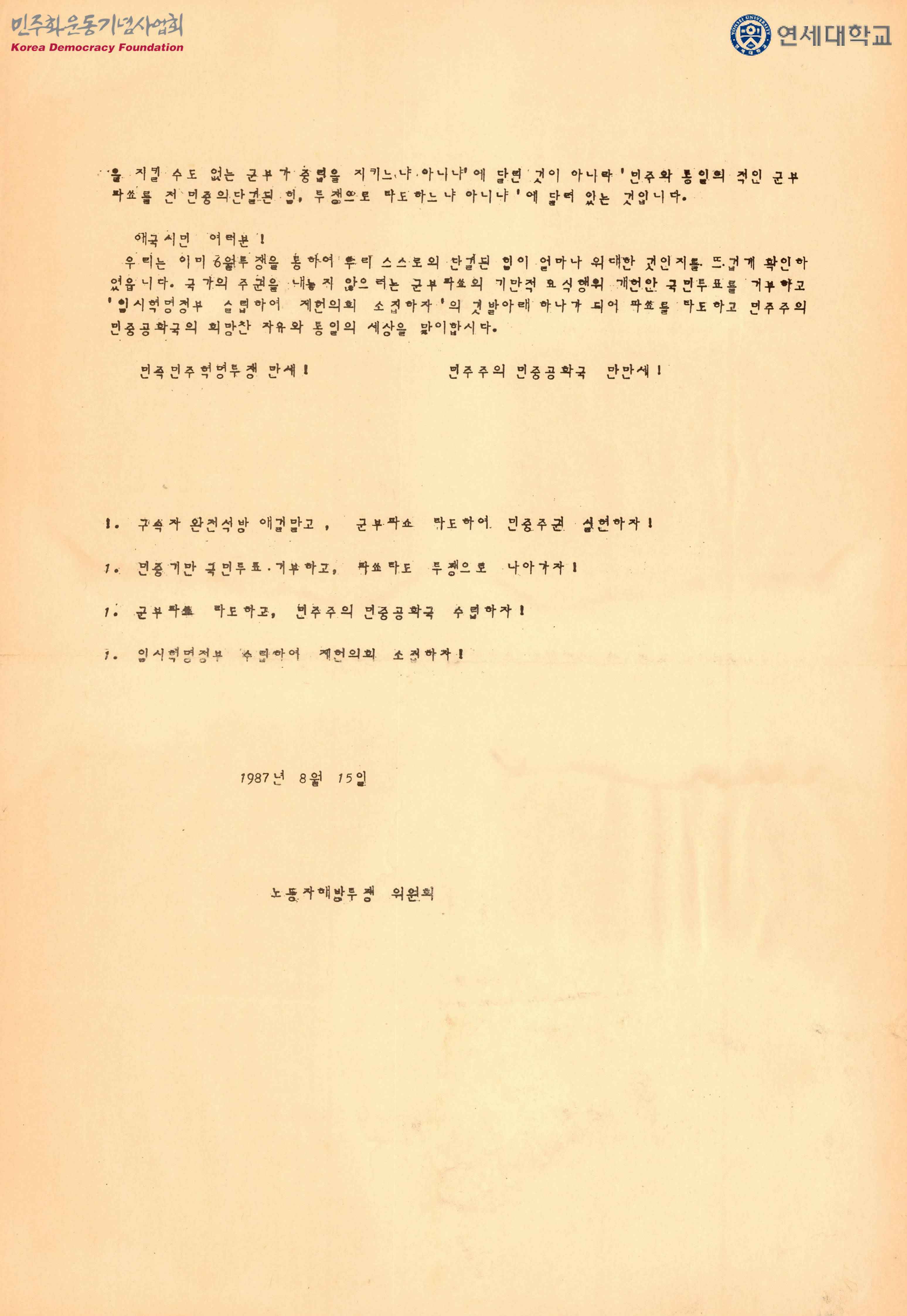 - 김대중 등 통일민주당 인사들의 군부와의 타협·반공·비폭력 등의 주장에 대한 비판, 군부를 타도하는 것에 민주화가 달려 있다며 구속자 완전석방 요청 반대·국민투표 거부·임시혁명정부 수립, 제헌의회 소집 등의 내용을 다룬 글