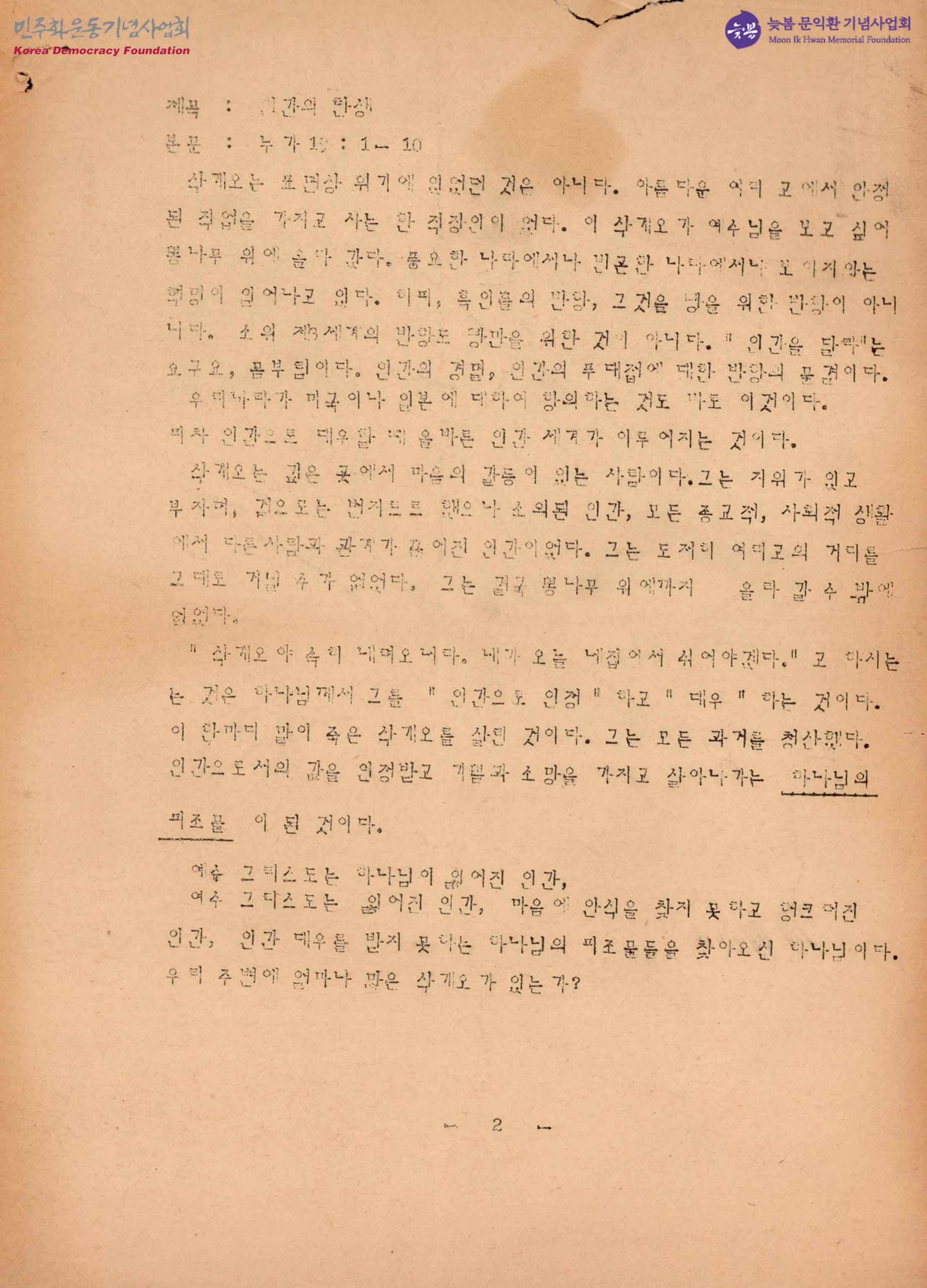- 수도교회에서 설교한 설교요약집으로 '인간의 탄생', '사고의 혁명'을 제목으로 하여 누가 19: 1~10, 창세기 25: 27~34의 설교 내용 등이 수록되어 있음