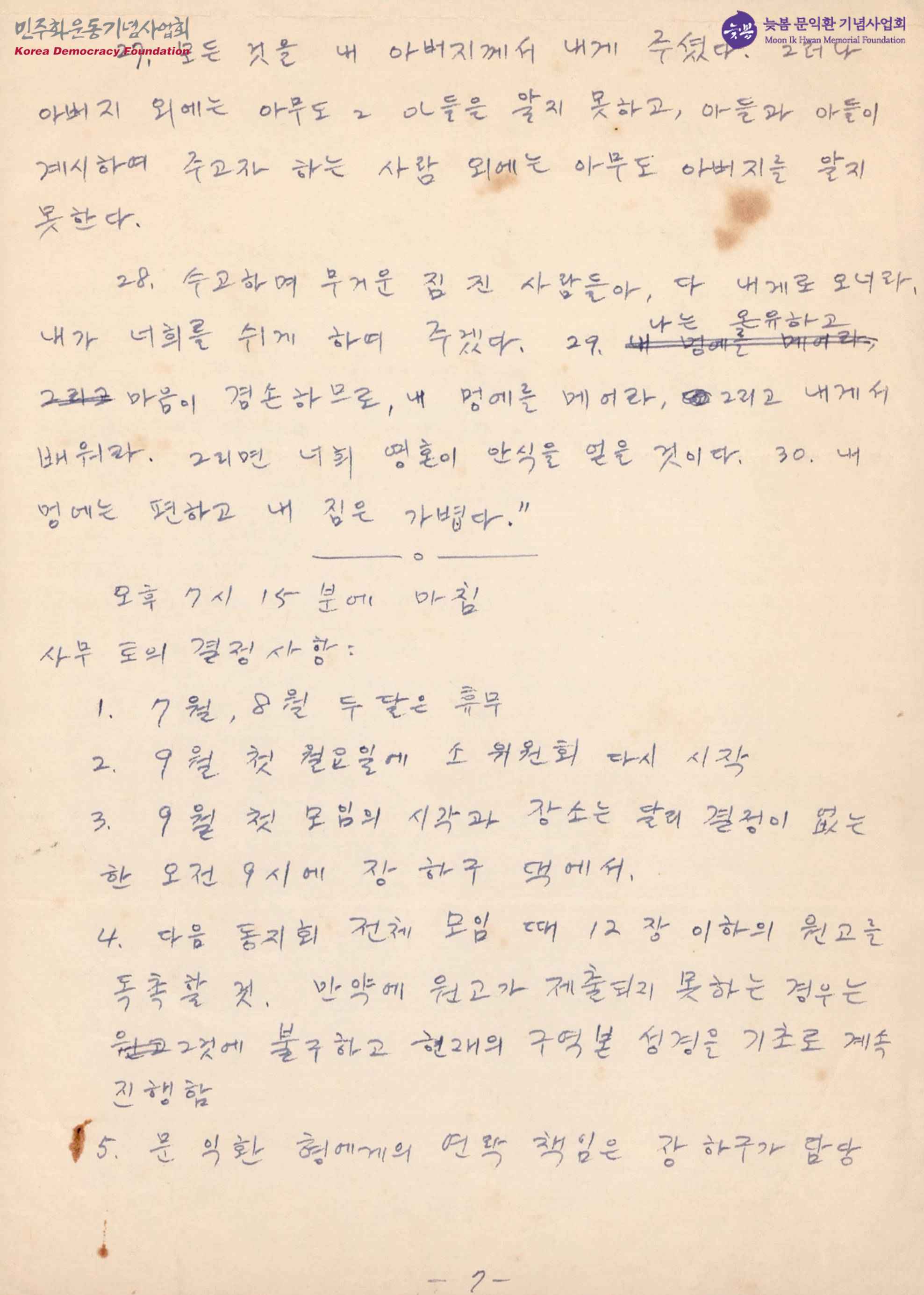 - 어느 성서의 번역본을 적은 메모로 장하구, 문익환의 사무 토의 결정사항 등이 함께 수록되어 있음