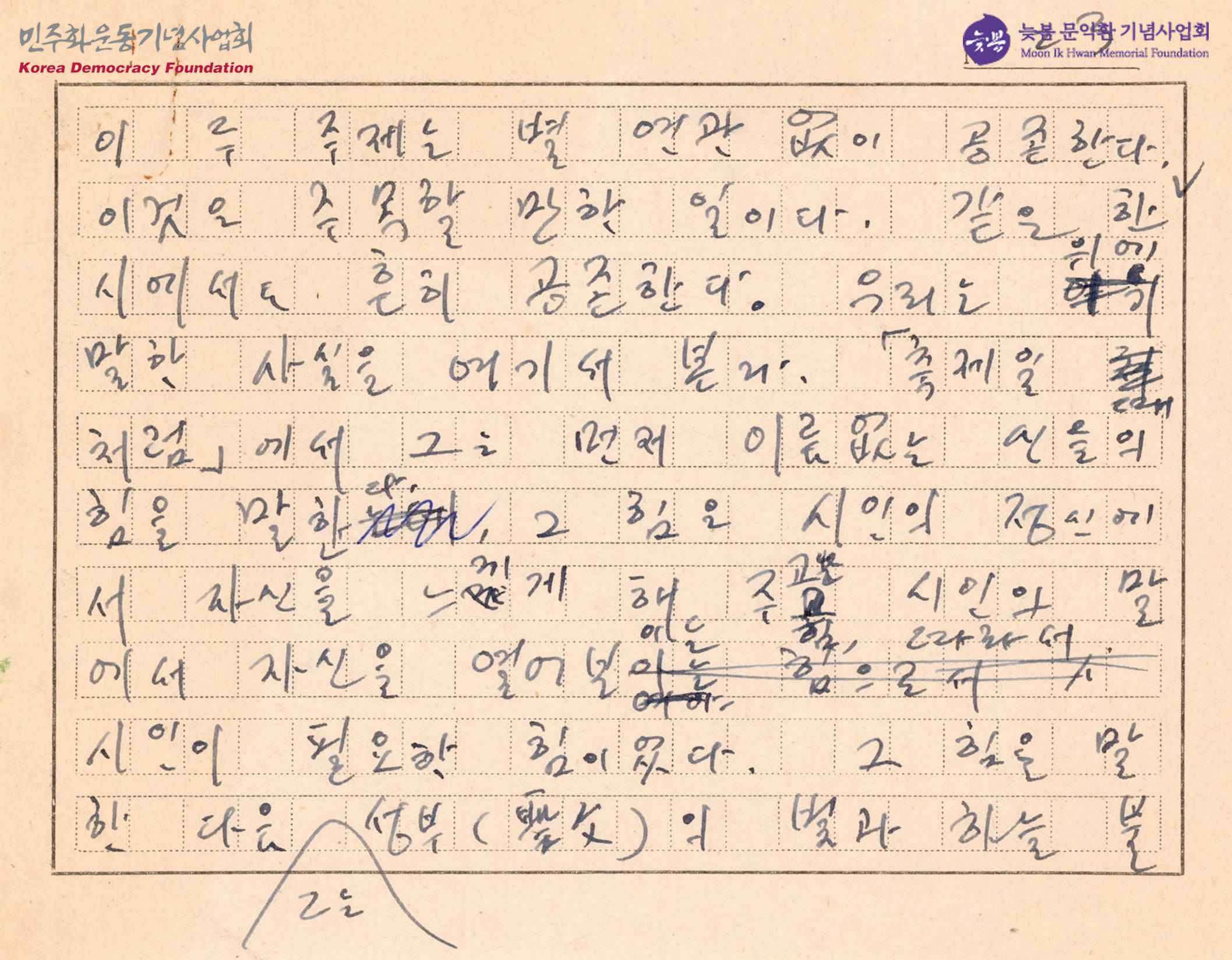 - 문익환이 친구인 윤동주의 작품에 대한 평론을 한 것으로 추정되는 원고로, 시구(詩句)를 통해 신앙고백 등 기독교적 특징에 대해 서술함