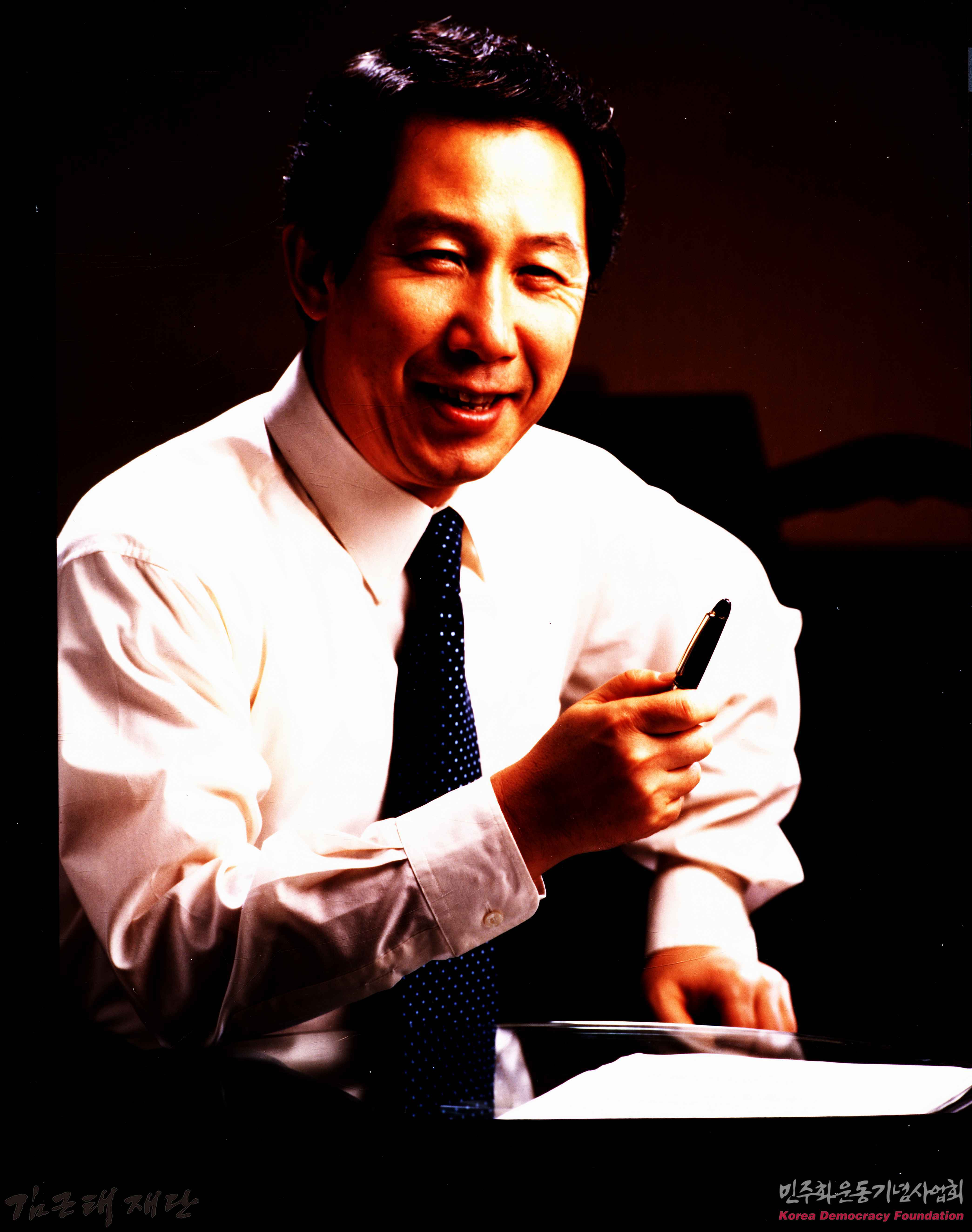 - 흰색 와이셔츠에 흰색 점무늬가 새겨진 감색 넥타이를 매고 만년필을 들고 찍은 김근태의 프로필 사진