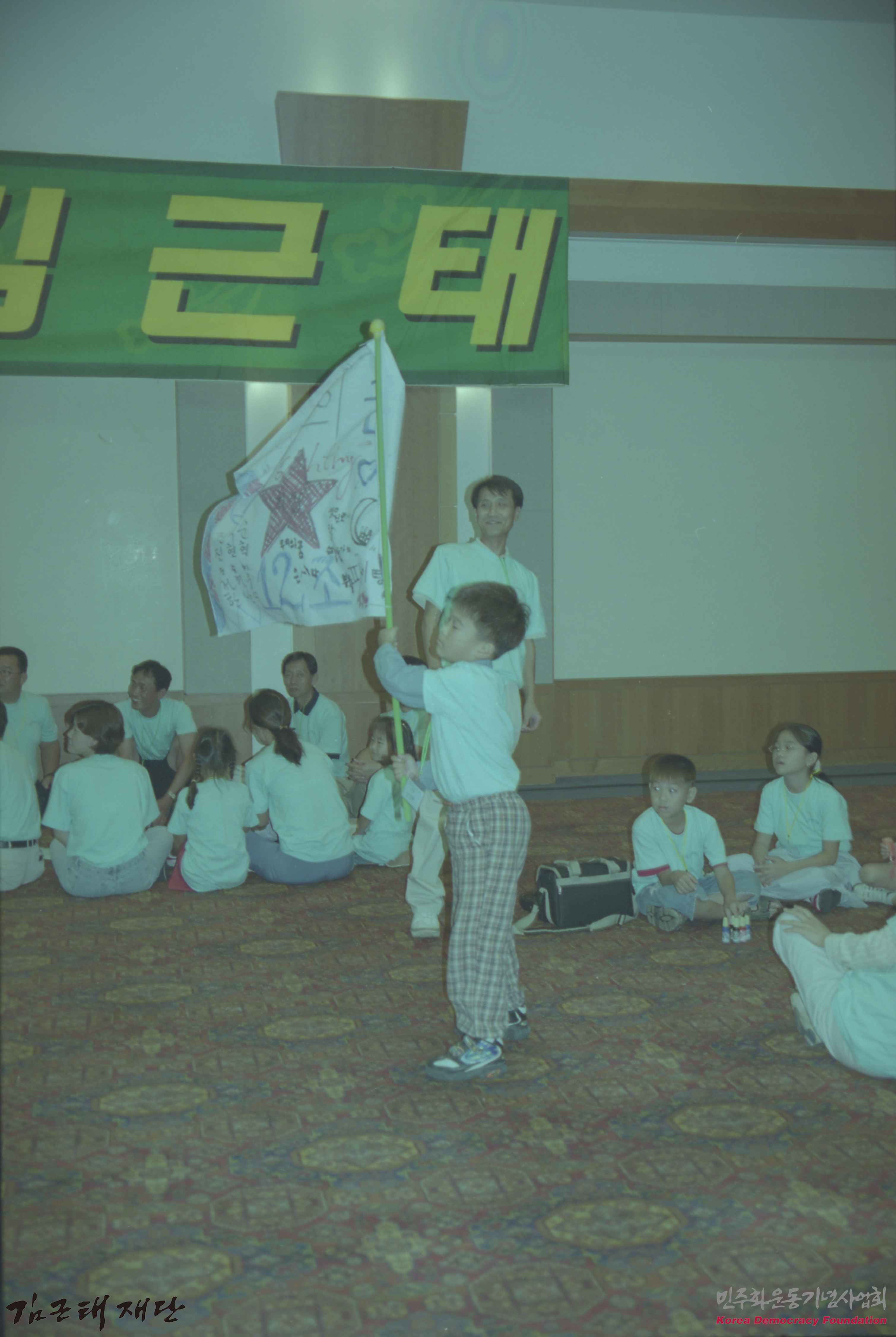 - 김근태친구들 2002 여름캠프로 추정되는 장소에서 한 어린이가 별 모양 깃발을 들고 서 있는 모습