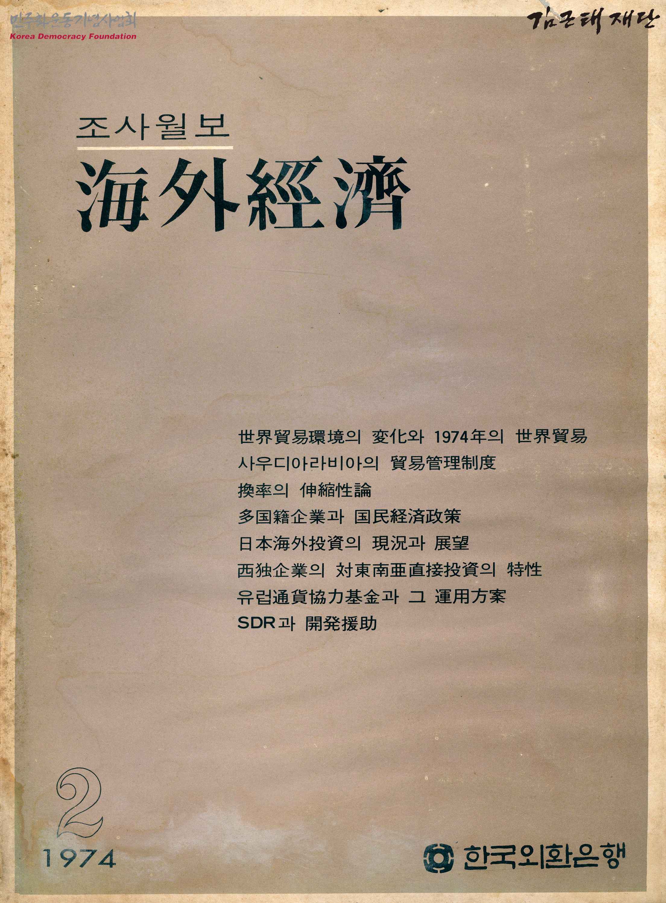 - 주요 목차는 다음과 같음 - 세계무역환경의 변화와 1974년의 세계무역 - 사우디아라비아의 무역관리제도 - 환율의 신축성론 - 다국적기업과 국민경제정책 - 일본해외투자의 현황과전망 - 서독기업의 대동남아직접투자의 특성 - 유럽통화협력기금과 그 운용방안 - SDR과 개발원조