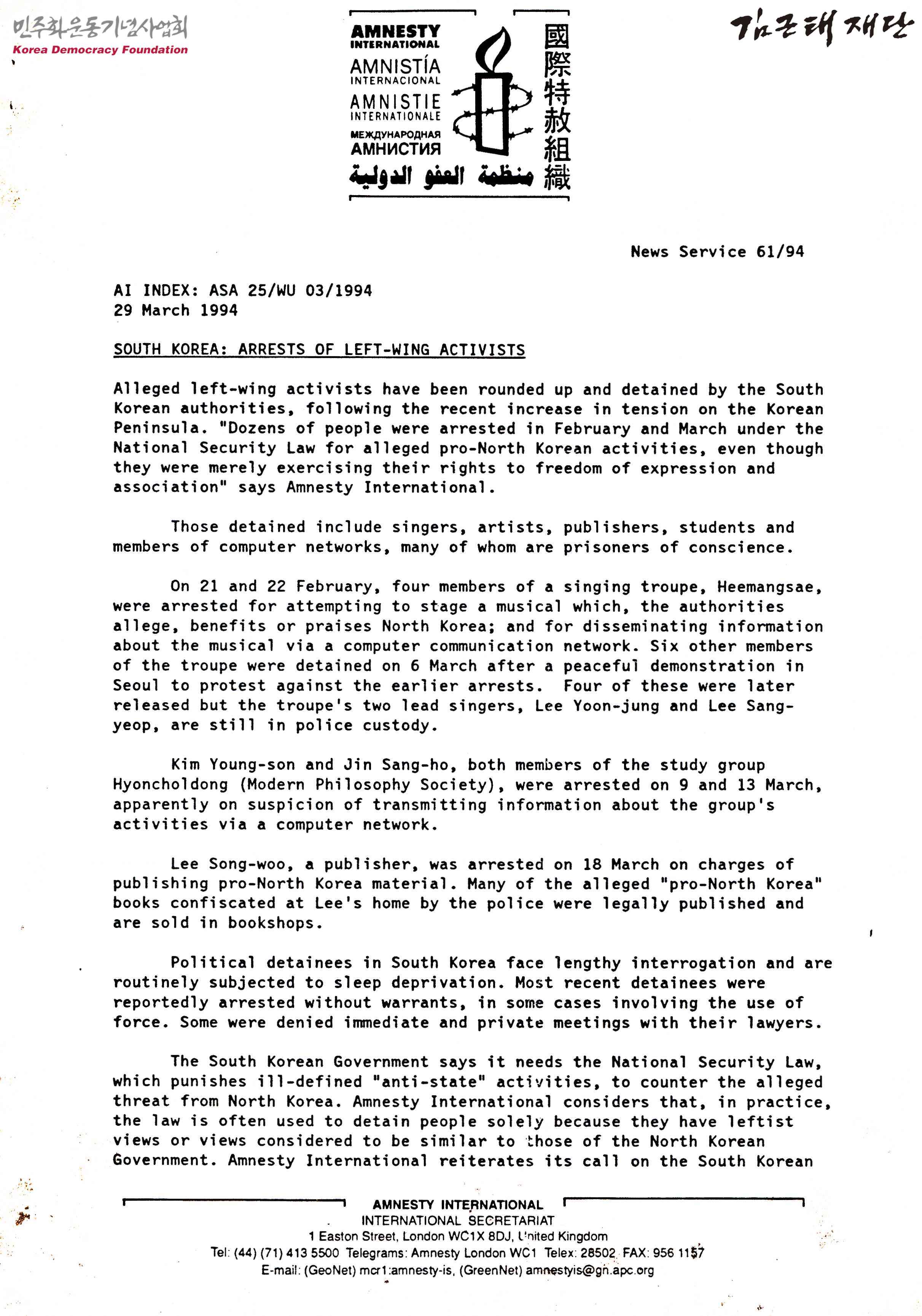 - 한국 정부에게 억류된 정치범들의 무조건적인 석방을 호소하고 있는 내용임